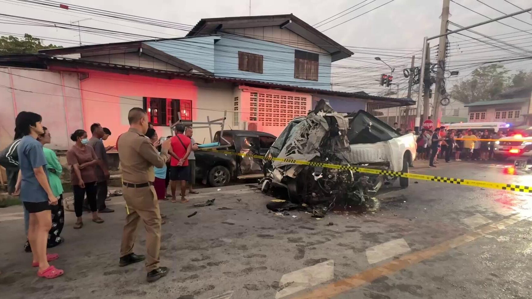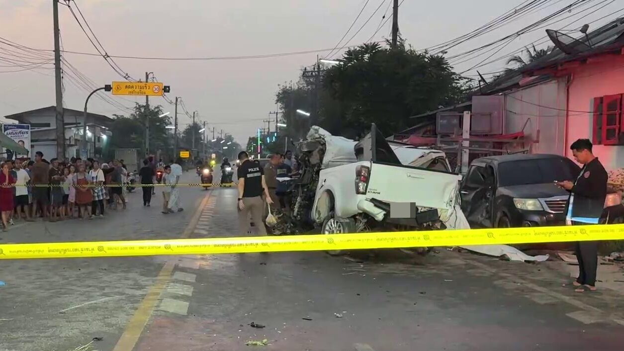วงจรปิดจับนาทีสลด กระบะตีนผี ซิ่งฝ่าไฟแดง ชนรูด 3 คัน พุ่งชนเสาไฟฟ้า หนุ่มสาวเสียชีวิต 5 ศพ ชาวบ้านเล่าระทึก เสียงดังสนั่น ก่อนพบร่างเกลื่อนถนน
