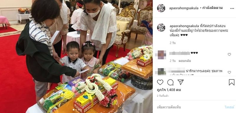 นอกจากนั้นยังมีโมเมนต์พี่น้องน่าเอ็นดูขณะไปทำบุญที่วัด “พี่กัสสปกำลังสอนน้องมีก้าและมีญ่าให้ช่วยจัดของถวายพระเพิ่มค่ะ”
