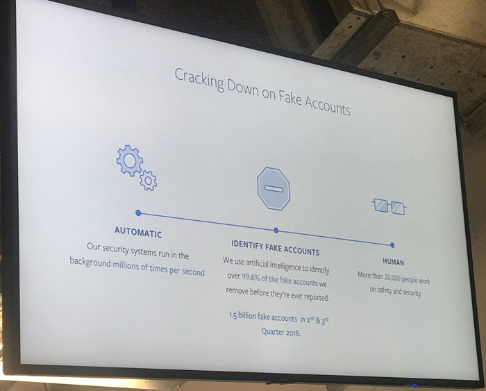โดยในไตรมาสที่ 3 ประจำปี 2018 Facebook ได้ปิดบัญชีปลอมจำนวน 754 ล้านบัญชี ซึ่งบัญชีส่วนใหญ่มาจากการโจมตีแบบสแปม ที่มีแรงจูงใจในการแสวงหาผลกำไร
