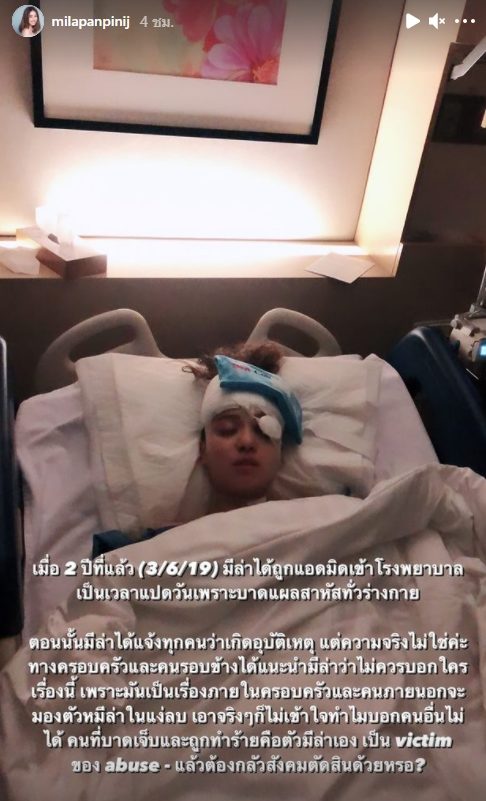 มีล่า เล่าว่า เมื่อ 2 ปีที่แล้ว วันที่ 3 มิ.ย.62 มีล่าได้ถูกแอดมิดเข้าโรงพยาบาลเป็นเวลา 8 วันเพราะบาดแผลสาหัสทั่วร่างกาย ตอนนั้นมีล่าได้แจ้งทุกคนว่าเกิดอุบัติเหตุ แต่ความจริงไม่ใช่ ทางครอบครัวและคนรอบข้างได้แนะนำว่ามีล่าไม่ควรบอกใครเรื่องนี้ เพราะเป็นเรื่องภายในครอบครัวและคนภายนอกจะมองตัวมีล่าในแง่ลบ เอาจริงๆก็ไม่เข้าใจว่าทำไมบอกคนอื่นไม่ได้ คนที่บาดเจ็บและถูกทำร้ายคือตัวมีล่าเอง เป็น Victim ของ Abuse แล้วต้องกลัวสังคมตัดสินด้วยเหรอ?