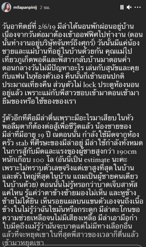 2 ปีที่ผ่านมา มีล่าได้ย้ายไปอยู่คอนโดกับแฟนและไม่กล้ากลับไปเหยียบที่บ้านนั้นอีกเลย ตอนมีล่ามีสติแล้วก็ได้บอกครอบครัวว่าไม่ยอมแล้วต้องแจ้งความ แต่ครอบครัวบอกว่าถ้าแจ้งความเรื่องนี้จะเป็นข่าว อยากให้ทั้งโลกรู้เหรอว่ามีน้องเป็นบ้า อยากให้ทุกคนจำว่าเป็นนักร้องคนนั้นที่ถูกน้องชายเอามีดแทงจนเกือบตายเหรอ