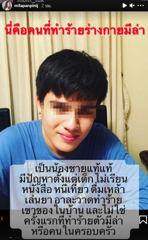 ภาพน้องชายที่ทำร้ายมีล่า มีปัญหาตั้งแต่เด็ก ไม่เรียนหนังสือ หนีเที่ยว ดื่มเหล้า เล่นยา อาละวาดทำร้ายข้าวของในบ้าน และไม่ใช่ครั้งแรกที่ทำร้ายตัวมีล่าหรือคนในครอบครัว