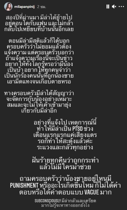 เหตุผลที่มีล่ามาบอกทุกคนวันนี้ก็เพราะว่าอึดอัดใจมากไม่อยากเก็บความลับแล้ว และที่สำคัญ ในระยะเวลา 2 ปีที่ผ่านมา ทางครอบครัวได้ปิดบังที่อยู่และทุกอย่างเกี่ยวกับน้องชาย มีล่าใช้ชีวิตหวาดระแวงมาเกินไปแล้ว มีล่าต้องการความยุติธรรม เท่าที่รู้คือครอบครัวพาน้องไปศรีธันยา แต่เขาไม่อนุญาตให้แอดมิทเกิน 2 เดือน เพราะไม่ใช่เคสที่หนักหนาขนาดนั้น