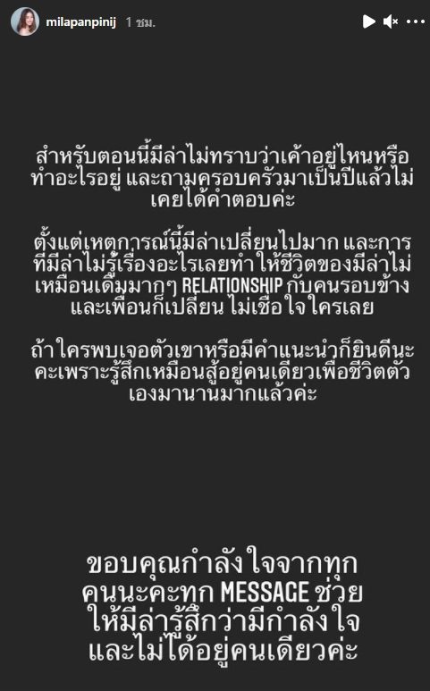 สำหรับตอนนี้มีล่าไม่ทราบว่าเขาอยู่ไหนหรือทำอะไรอยู่ และถามครอบครัวมาเป็นปีแล้วไม่เคยได้คำตอบ ตั้งแต่เหตุการณ์นี้มีล่าเปลี่ยนไปมาก และการที่มีล่าไม่รู้เรื่องอะไรเลย ทำให้ชีวิตของมีล่าไม่เหมือนเดิม ความสัมพันธ์กับคนรอบข้างและเพื่อนเปลี่ยนไม่เชื่อใจใครเลย ถ้าใครพบเจอเขาหรือมีคำแนะนำก็ยินดี เพราะรู้สึกเหมือนสู้อยู่คนเดียวเพื่อชีวิตตัวเองมานานมากแล้ว