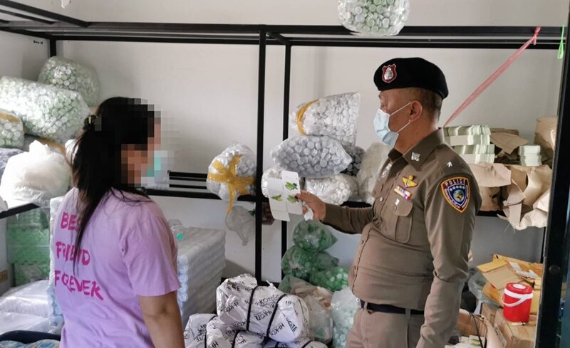เช่น ครีมสมุนไพรมะระ ยี่ห้อ Kissing, ครีมขมิ้นเฮอร์เบิล, ครีมสมุนไพรบ้านตะวัน, ครีมบํารุง ผิวหน้าเลนาว, พีแคร์ครีม สมุนไพรขิง, ครีมไข่มุกผสมบัวหิมะ พบเครื่องจักร และอุปกรณ์การผลิตหลายรายการ ทั้งหมดไม่ได้ขออนุญาตจาก อย.จัดเป็นเครื่องสําอางปลอม จึงตรวจยึดนําส่งกก.4 บก.ปคบ. ดําเนินคดีต่อไป