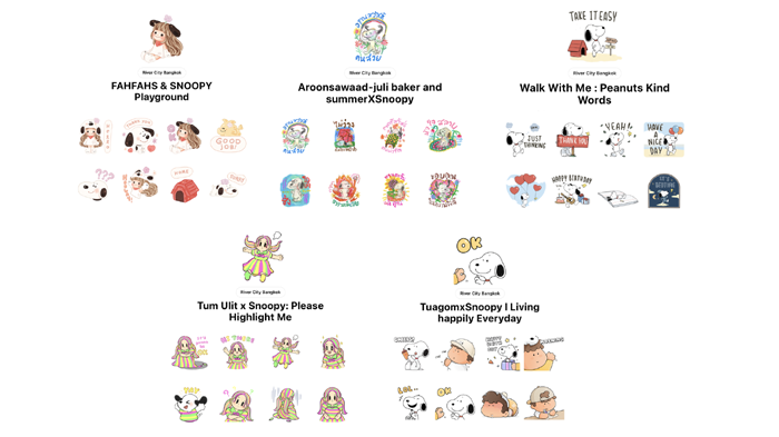 ท่ามกลางกระแสตอบรับที่ดีนี้ LINE STICKERS ได้ทำงานร่วมกับ River City Bangkok ต่อยอดประสบการณ์ศิลปะจากแกลเลอรีสู่โลกดิจิทัล ผ่านคอลเลกชันสติกเกอร์ Snoopy พิเศษ 5 ชุด โดย 5 ศิลปินไทยชื่อดัง ได้แก่ FAHFAHS, Tum Ulit, Juli Baker and Summer, Tuagomstudio และ Munins เพื่อให้ผู้ชมสามารถพาแรงบันดาลใจและความประทับใจจากนิทรรศการกลับไปอยู่กับตัวเองได้ทุกวัน ผ่านการใช้งานสติกเกอร์บนแพลตฟอร์ม LINE ในชีวิตประจำวัน