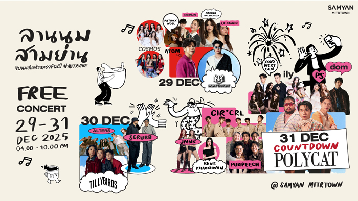 วันที่ 29 ธ.ค. นำโดยศิลปินสายเอนเตอร์เทน นนท์ ธนนท์ และ อะตอม ชนกันต์ ต่อด้วยวันที่ 30 ธ.ค. ร้องเพลงฮิตกันให้ดังสุดเสียงกับวง Scrubb ต่อด้วยวงดนตรีสุดเท่ Tilly Birds ส่งท้ายความสนุกให้สุดใน วันที่ 31 ธ.ค. “นับถอยหลังเคานต์ดาวน์” ก้าวสู่ปี 2026 ไปพร้อมกับเสียงเพลงจากศิลปินสุดยูนีค POLYCAT พร้อมเติมเต็มโมเมนต์ชนนมข้ามปี ด้วย “Confetti fills the air at Samyan Mitrtown หิมะกลางสามย่าน” ซีนส่งท้ายปีเก่า ที่สามย่านมิตรทาวน์ตั้งใจยกระดับโมเมนต์ข้ามปีให้พิเศษกว่าที่เคย ด้วย Confetti กว่า 300,000 ชิ้น โปรยลงมาปกคลุมพื้นที่ เปลี่ยนค่ำคืนแห่งการเคาท์ดาวน์ให้กลายเป็นพื้นที่ของความสุขและพลังบวก ที่ต้องมาสัมผัสด้วยตัวเองเท่านั้น”