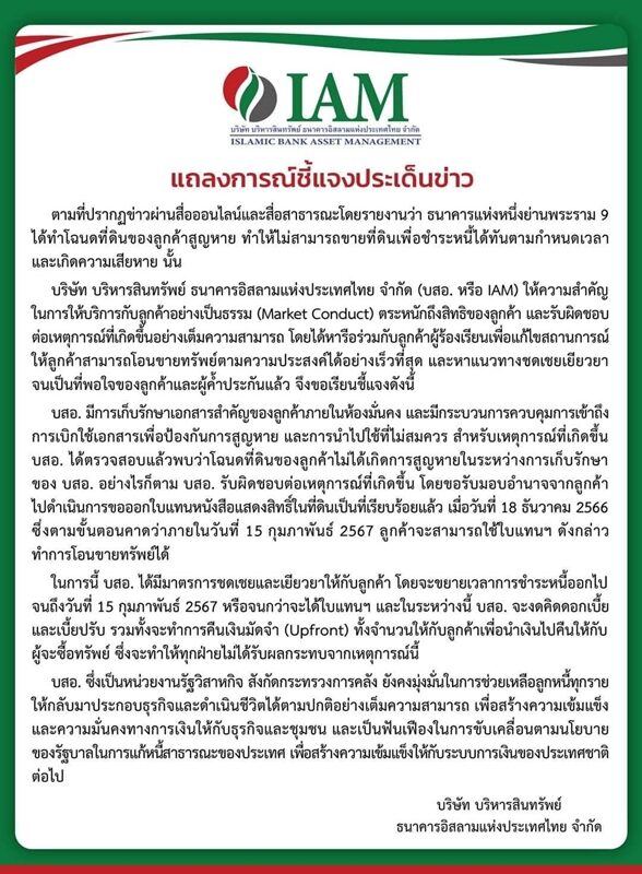 วันที่ 21 ธ.ค.66 บริษัทบริหารสินทรัพย์ ธนาคารอิสลามแห่งประเทศไทย จำกัด ได้ออกหนังสือชี้แจง ปมทำโฉนดกู้เงินลูกค้าหาย โดยระบุว่า