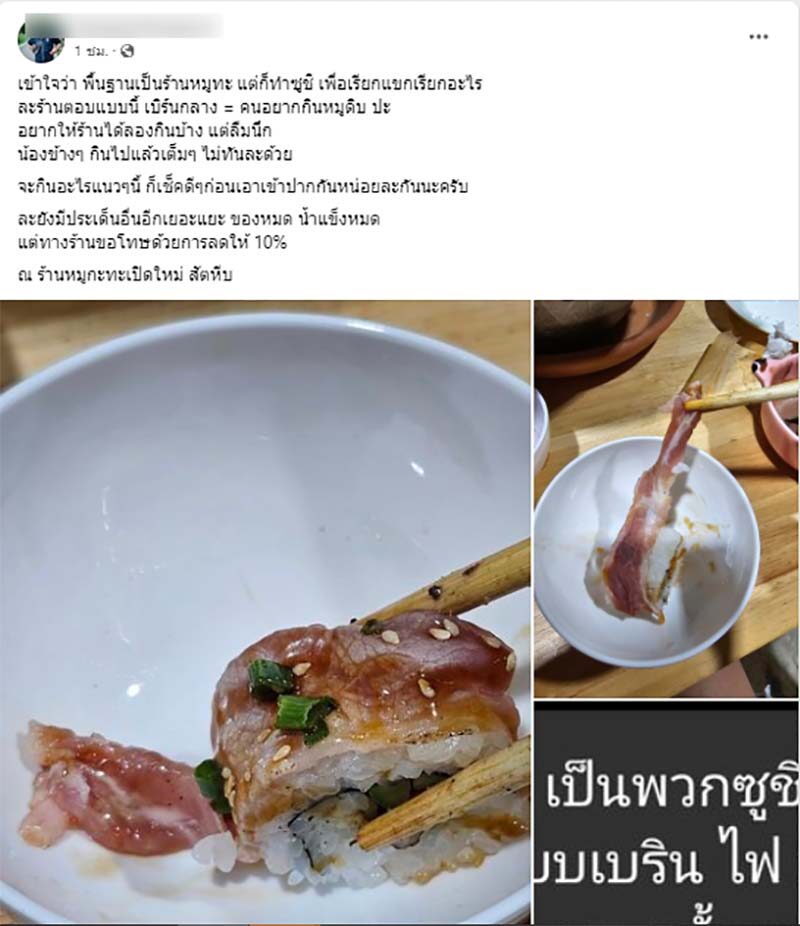โดยผู้โพสต์ได้เขียนคำบรรยายว่า "เข้าใจว่า พื้นฐานเป็นร้านหมูทะ แต่ก็ทำซูชิ เพื่อเรียกแขกเรียกอะไร ละร้านตอบแบบนี้ เบิร์นกลาง = คนอยากกินหมูดิบ ปะ อยากให้ร้านได้ลองกินบ้าง แต่ลืมนึก น้องข้างๆ กินไปแล้วเต็มๆ ไม่ทันละด้วย จะกินอะไรแนวๆ นี้ ก็เช็คดีๆ ก่อนเอาเข้าปากกันหน่อยละกันนะครับ ละยังมีประเด็นอื่นอีกเยอะแยะ ของหมด น้ำแข็งหมด แต่ทางร้านขอโทษด้วยการลดให้ 10% ณ ร้านหมูกะทะเปิดใหม่ สัตหีบ"