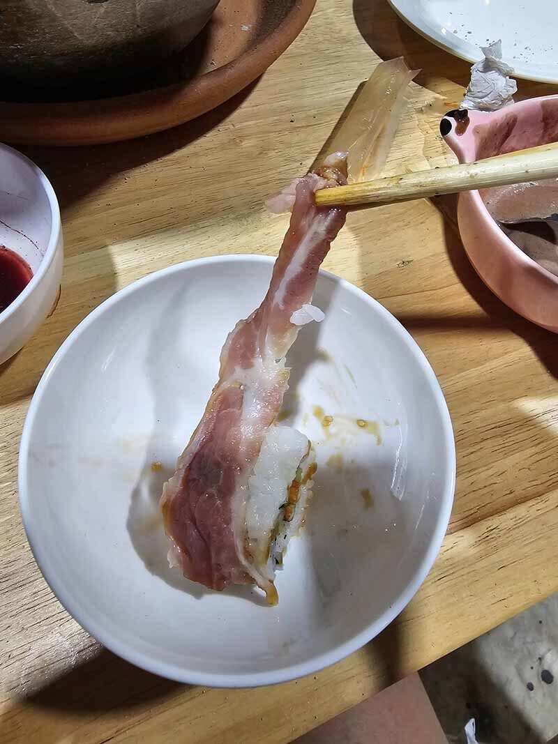 วันที่ 29 พ.ย. 2566 ผู้สื่อข่าวรายงานว่า มีผู้ใช้เฟซบุ๊กรายหนึ่งโพสต์ภาพลงในกลุ่มพวกเราคือผู้บริโภค หลังไปรับประทานอาหารที่ร้านหมูกระทะแห่งหนึ่งใน อ.สัตหีบ จ.ชลบุรี โดยเมนูซูชิเนื้อหมู สภาพยังเป็นหมูดิบ ซึ่งไม่สามารถรับประทานได้ เนื่องจากในหมูดิบ ก่อให้เกิดโรคมากมาย เช่น โรคไข้หูดับ โรคพยาธิตืดหมู โรคพยาธิทริคิโนซิส