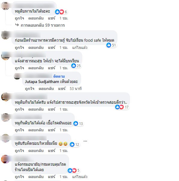 ทำให้มีผู้เข้ามาแสดงความคิดเห็นเป็นจำนวนมากว่า อันตรายมาก หมูดิบไม่สามารถรับประทานได้ ทำร้านอาหารไม่รู้เรื่องได้อย่างไร ไม่ถูกสุขลักษณะ พร้อมแนะนำให้แจ้งสาธารณสุขจังหวัดให้เข้าตรวจสอบ