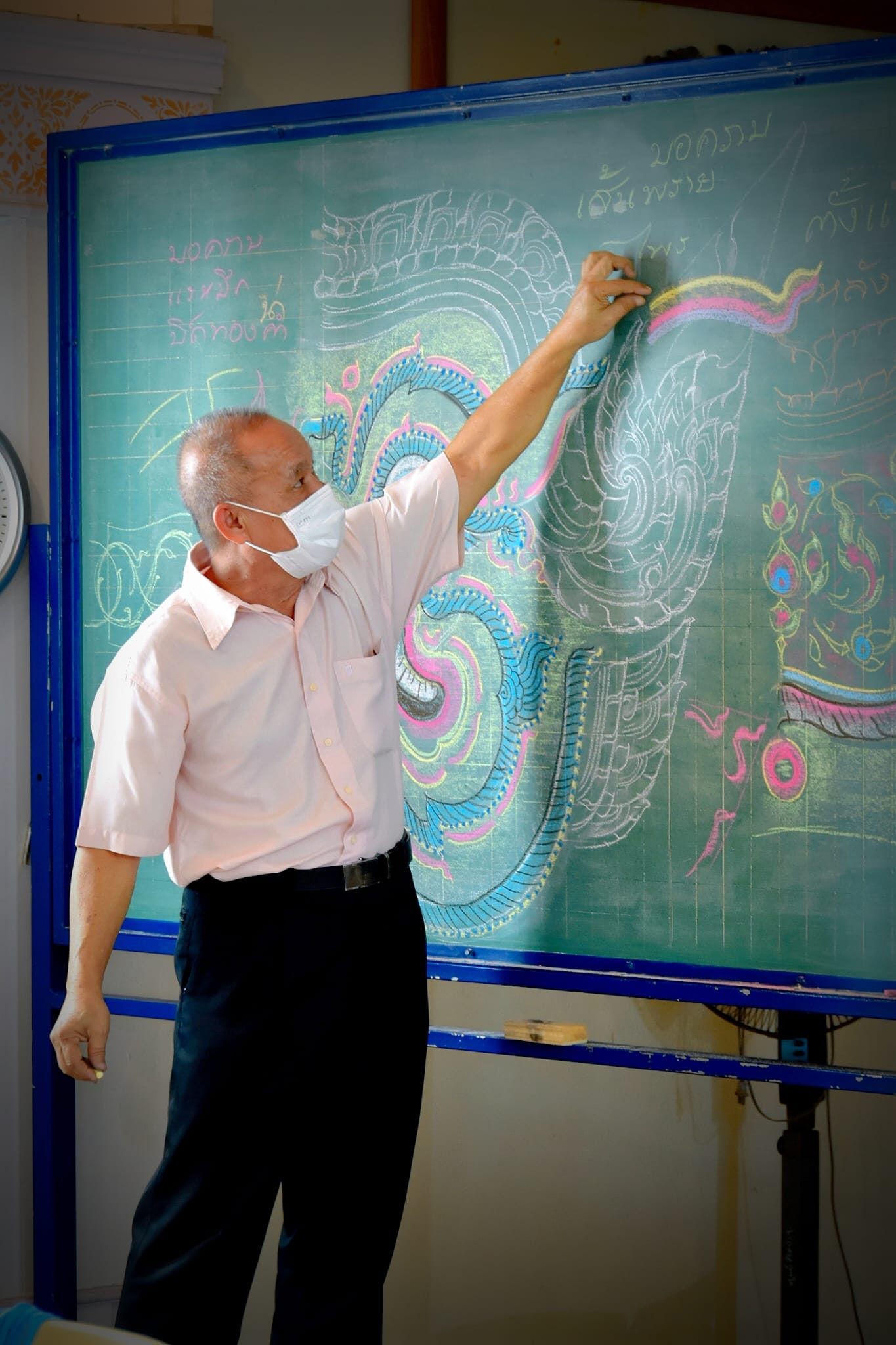 ฝีมือชั้นครู! นายช่าง 'สมชาย ศุภลักษณ์อำไพพร' ศิลปินมือออกแบบชื่อดัง โชว์ฝีมือระดับเทพ ใช้ชอล์กวาดรูปยักษ์และลายไทยบนกระดานดำ งดงามแทบไม่กล้าลบ