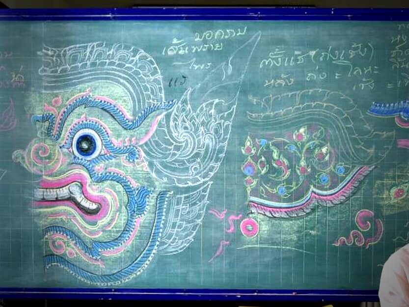 โดยภาพดังกล่าว เป็นการใช้'ชอล์ก' วาดลวดลายเนรมิตร 'กระดานดำ' ให้กลายเป็นงานศิลปะล้ำค่า ที่ใครเห็นก็บอกว่างดงามจนไม่กล้าลบ เพราะเป็นภาพลวดลายไทย และภาพยักษ์ สุดวิจิตรอลังการ ซึ่งเจ้าของผลงานก็คือ นาย "สมชาย ศุภลักษณ์อำไพพร" นายช่างศิลปกรรม อาวุโส ณ สำนักช่างสิบหมู่ กรมศิลปากร