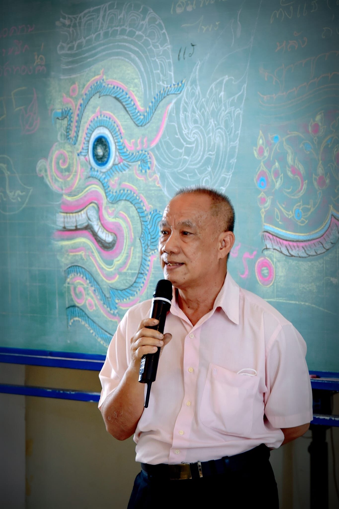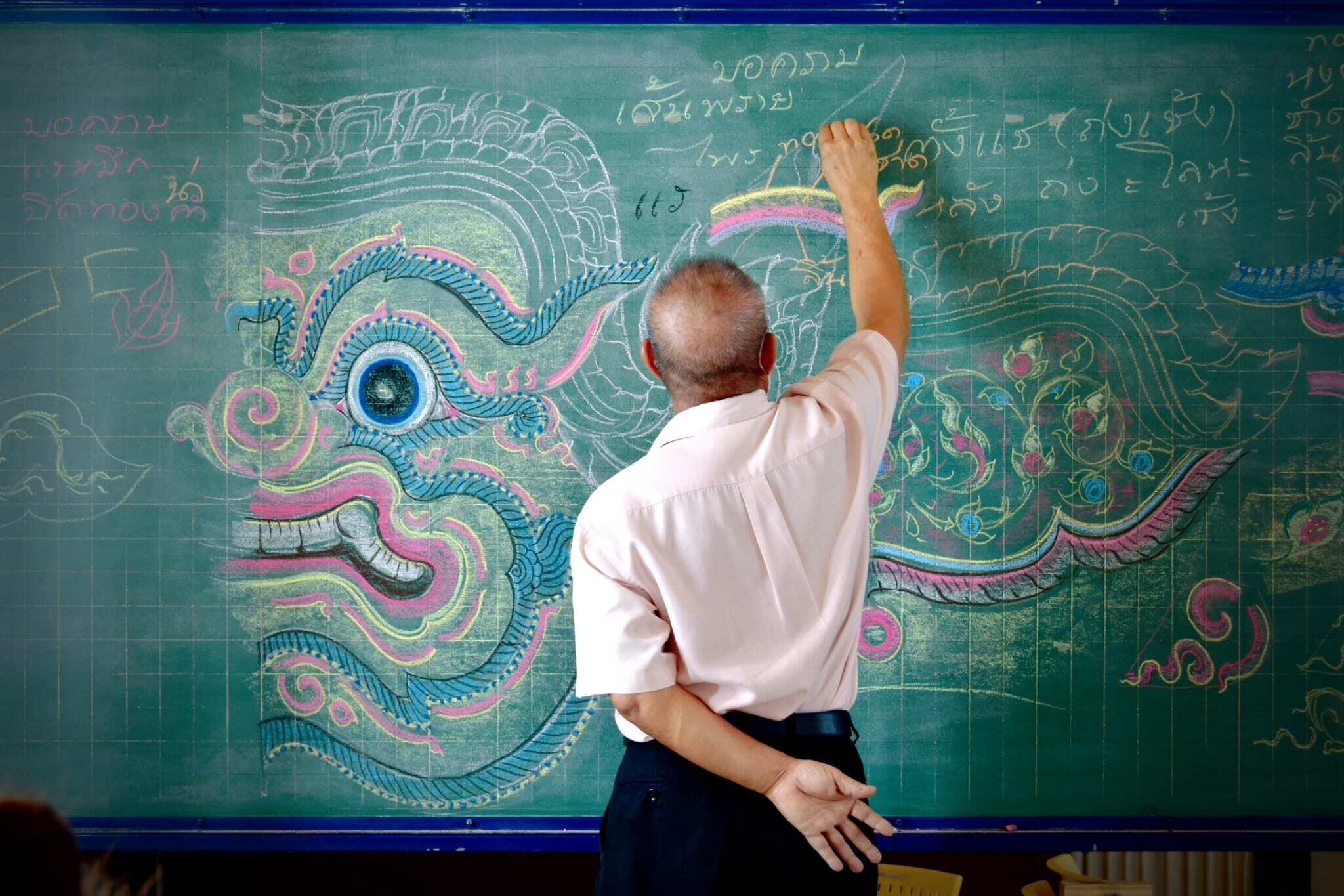 - "เส้นลายไทยลงชอล์กในกระดานดำ สวยจริงๆ"