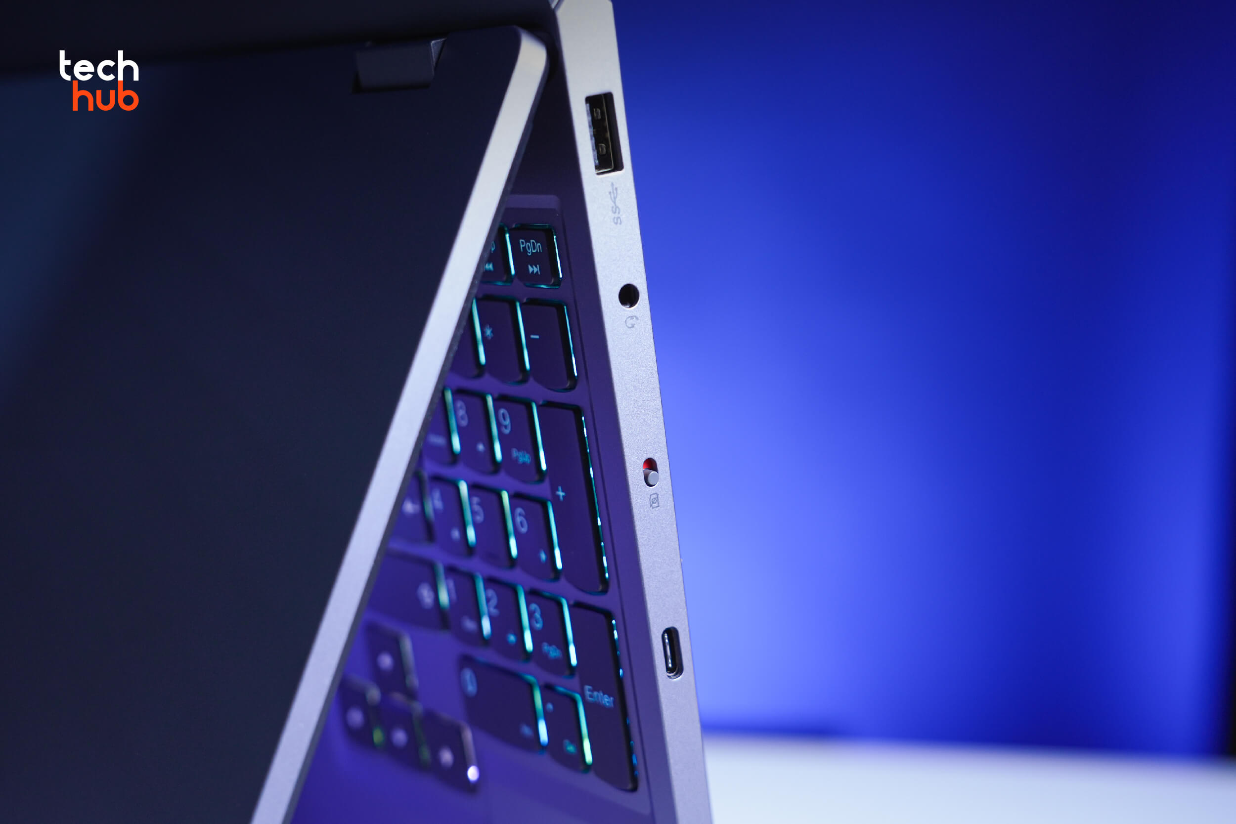 ส่วนด้านข้างนั้น จะมีแค่ USB-C 3.2 Gen 2 เป็น DisplayPort™ 1.4 ที่สามารถจ่ายพลังงานได้สูงสุด 140W , e-shutter สำหรับเปิด-ปิด การทำงานของกล้อง พอร์ตหูฟังแบบคอมโบ 3.5 mm และ USB-A 3.2 Gen 1