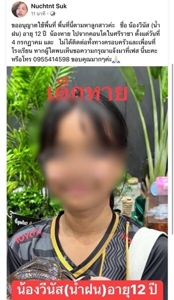 เจอแล้ว น้องน้ำฝน เด็กหญิงวัย 12 ปี แม่ประกาศตามหา หลังหายตัวปริศนานาน 4 วัน เผย มีคนโทรมาแจ้งเบาะแสเป็น 100 สาย จนพบน้อง ขอบคุณทุกคน