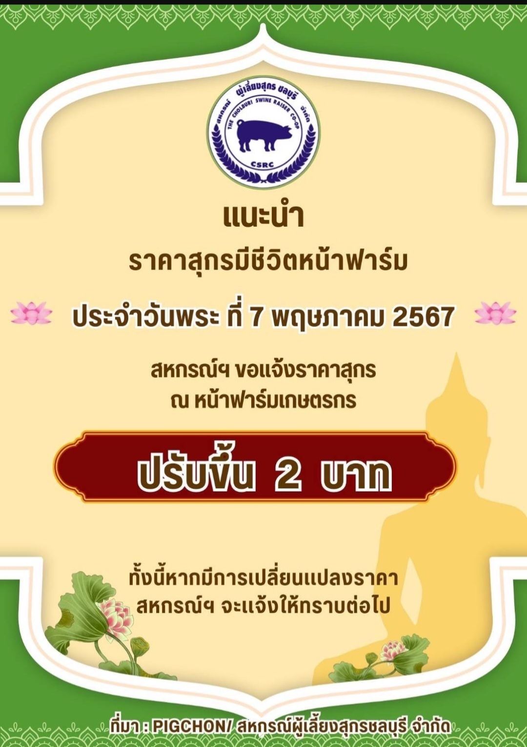 สำหรับการปรับราคาครัั้งนี้ สอดรับกับสหกรณ์ผู้เลี้ยงสุกรชลบุรี จำกัด ที่ได้ประกาศแจ้งสมาชิกสหกรณ์และเกษตรกรผู้เลี้ยงสุกร ว่า ราคาสุกรมีชีวิตหน้าฟาร์ม วันพระที่ 7 พฤษภาคม 2567 ปรับขึ้นอีก 2 บาทต่อกิโลกรัม จากฐานเดิม หลังจากเมื่อวันพระที่ 1 พฤษภาคม 2567 ที่ผ่านมา ภาคตะวันออก แจ้งประกาศราคาแนะนำสุกรขุน อยู่ที่ 76 บาทต่อกิโลกรัม ดังนั้นราคาจะ อยู่ที่ 80 บาทต่อกิโลกรัมเช่นกันทำล่วงหน้าไปประมาณ