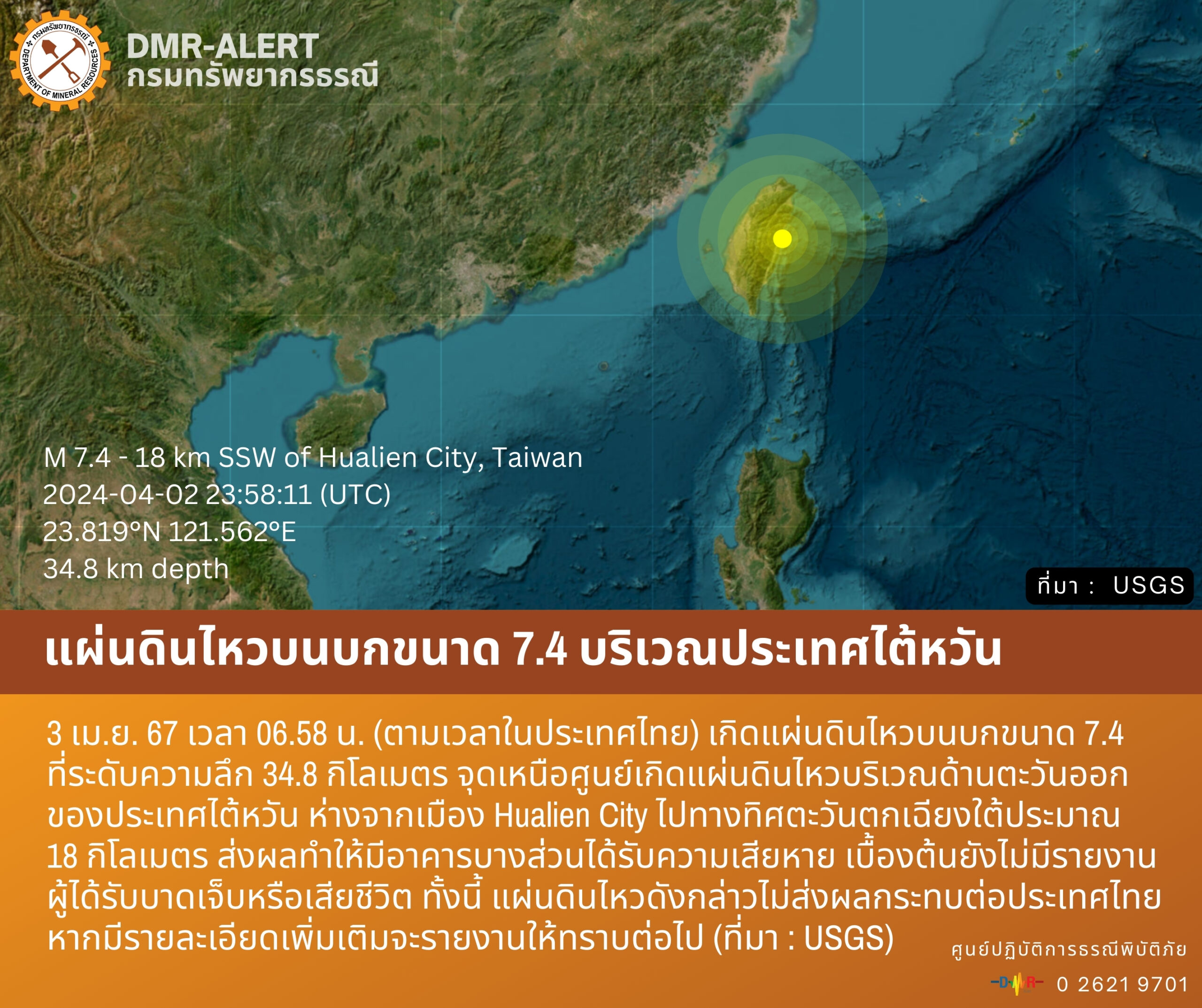 วันที่ 3 เมษายน 2567 ศูนย์ปฏิบัติการธรณีพิบัติภัย กรมทรัพยากรธรณี รายงาน 3 เม.ย. 67 เวลา 06.58 น. (ตามเวลาในประเทศไทย) เกิดแผ่นดินไหวบนบกขนาด 7.4 ที่ระดับความลึก 34.8 กิโลเมตร จุดเหนือศูนย์เกิดแผ่นดินไหวบริเวณด้านตะวันออกของประเทศไต้หวัน ห่างจากเมือง Hualien City ไปทางทิศตะวันตกเฉียงใต้ประมาณ 18 กิโลเมตร