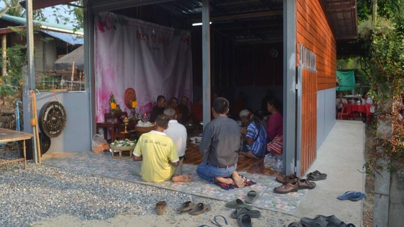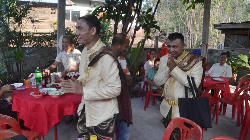 โดยในช่วงเช้าตั้งแต่ช่วงเวลา 07.00 คู่บ่าวสาว และญาติพี่น้องได้นิมนต์พระสงฆ์มาร่วมทำบุญตักบาตรที่บ้านงาน ถวายภัตตาหาร หลังจากเสร็จพิธีทางสงฆ์แล้ว ญาติพี่น้องที่มาร่วมงานร่วมแสดงความยินดี ผูกข้อไม้ข้อมือ กันอย่างชื่นมื่นทั้งฝ่ายชายและฝ่ายหญิงที่มาร่วมงาน