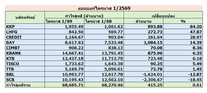 อย่างไรก็ดี หลายธนาคารยังสามารถรักษาการเติบโตของกำไรได้ จากแรงหนุนของรายได้ค่าธรรมเนียม รายได้ที่มิใช่ดอกเบี้ย การบริหารต้นทุน และคุณภาพสินทรัพย์ที่ยังอยู่ในเกณฑ์ควบคุมได้ โดยพบว่า มี 9ธนาคาร ที่กำไรสุทธิไตรมาส 1/2569เติบโตจากช่วงเดียวกันของปีก่อน ได้แก่ KKP, LHFG, CREDIT, BAY, CIMBT, KBANK, KTB, TISCO และ TTB ขณะที่ BBL และ SCB มีกำไรปรับตัวลดลง ดังตารางประกอบ