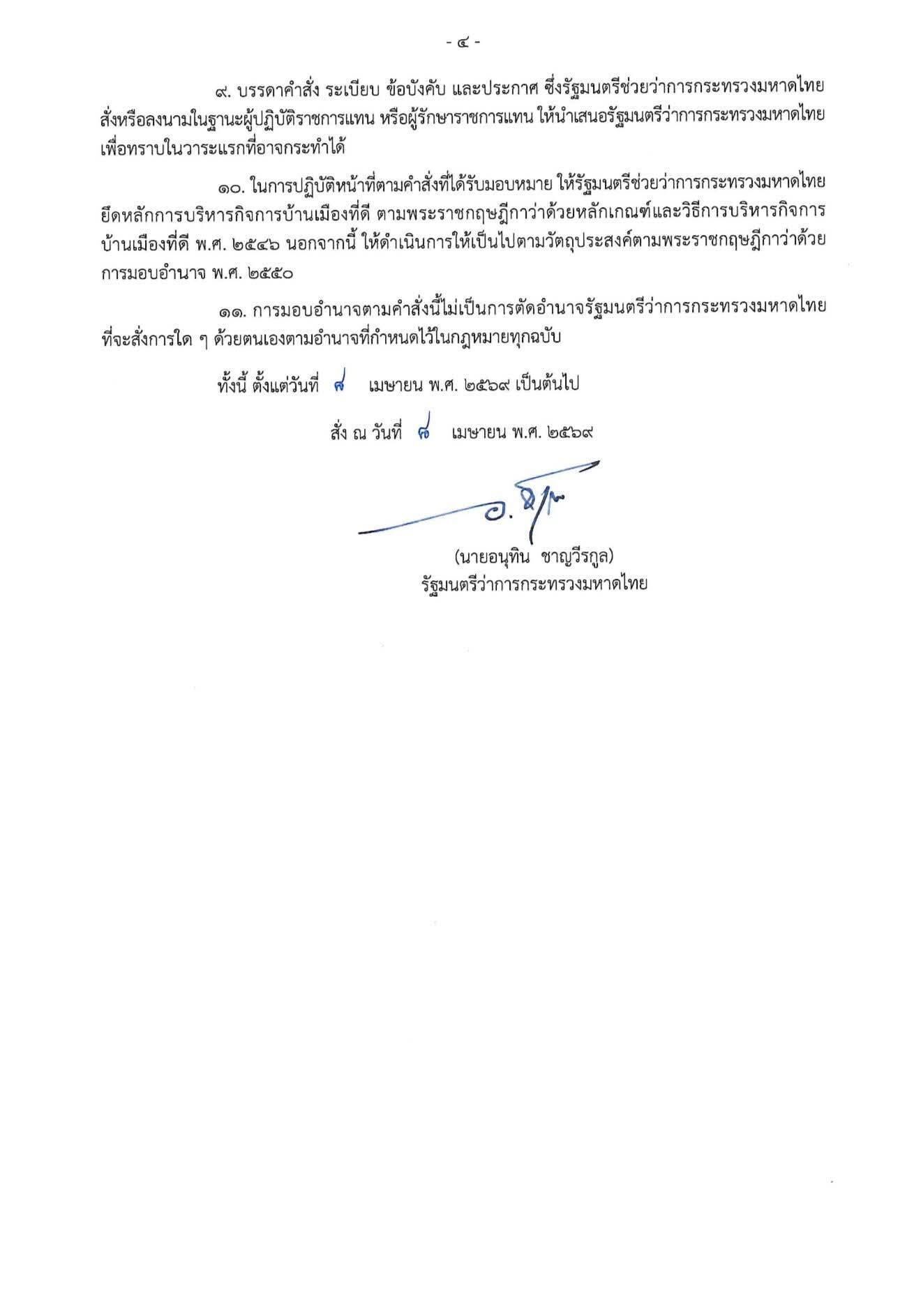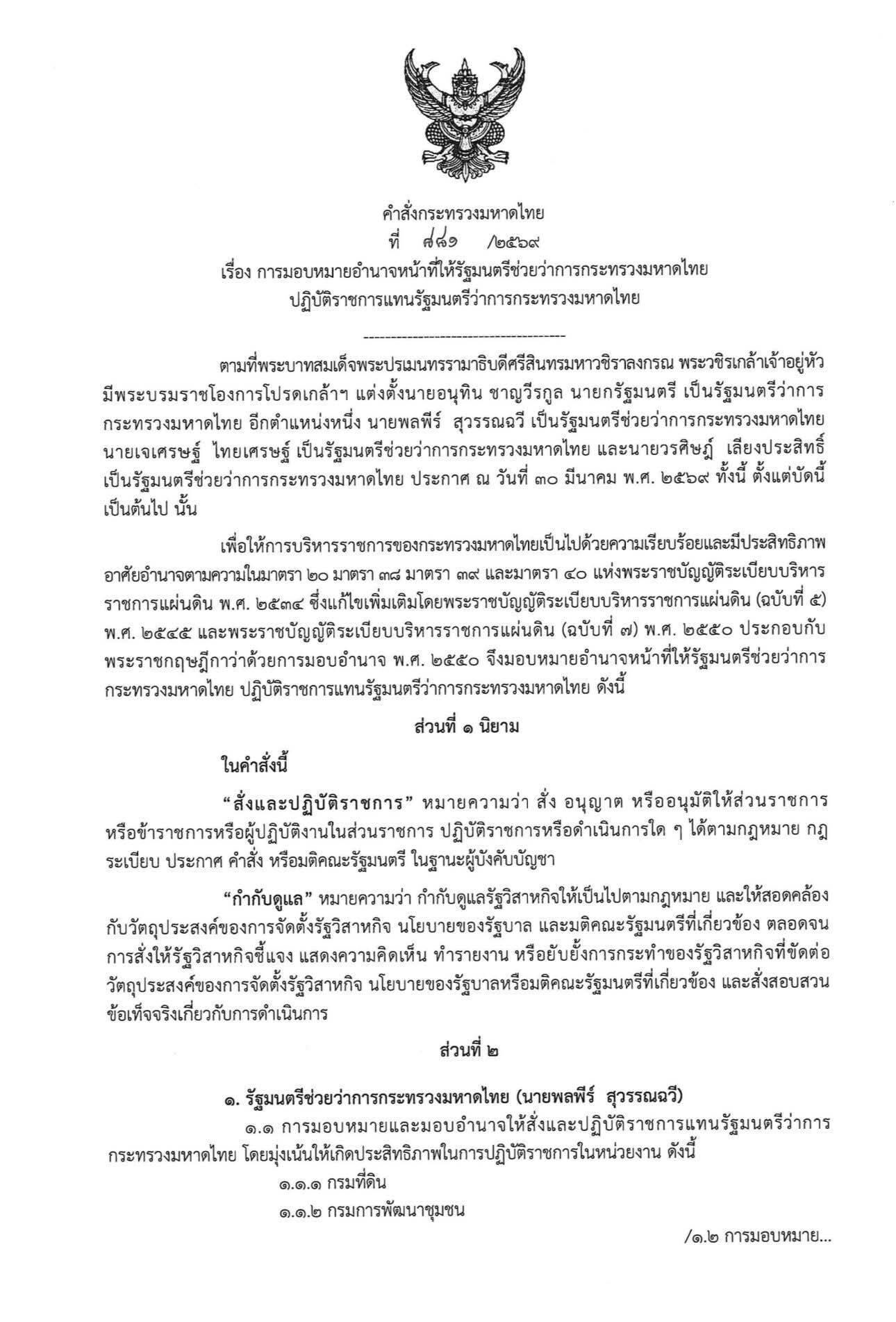 วันที่ 8 เม.ย. 2569 นายอนุทิน ชาญวีรกูล นายกรัฐมนตรีและรัฐมนตรีว่าการกระทรวงมหาดไทย ลงนามคำสั่งกระทรวงมหาดไทย ที่ 881/2569 เรื่อง การมอบหมายอำนาจหน้าที่ให้รัฐมนตรีช่วยว่าการกระทรวงมหาดไทยปฏิบัติราชการแทนรัฐมนตรีว่าการกระทรวงมหาดไทย ลงวันที่ 8 เมษายน 2569 โดยนายอนุทินสั่งและปฏิบัติราชการ สำนักงานรัฐมนตรี กระทรวงมหาดไทย สำนักงานปลัดกระทรวงมหาดไทย และกรมการปกครอง
