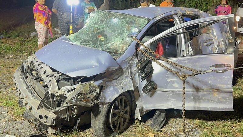 ที่เกิดเหตุพบรถเก๋ง ยี่ห้อโตโยต้า วีออส ทะเบียน นครศรีธรรมราช สภาพเสียหลักชนต้นไม้ข้างทางและพลิกคว่ำ มีผู้บาดเจ็บติดอยู่ภายในรถ โดยเฉพาะฝั่งคนขับ เจ้าหน้าที่ต้องใช้อุปกรณ์ตัดถ่างเพื่อนำร่างออกมา