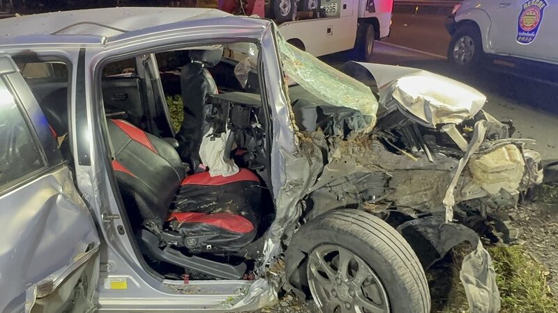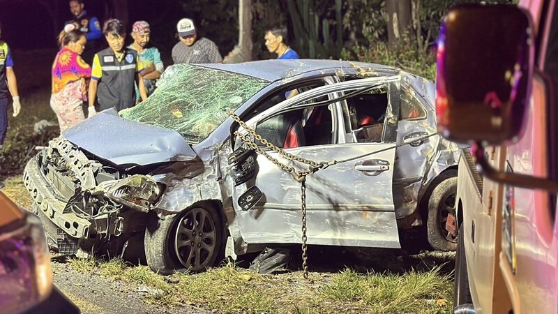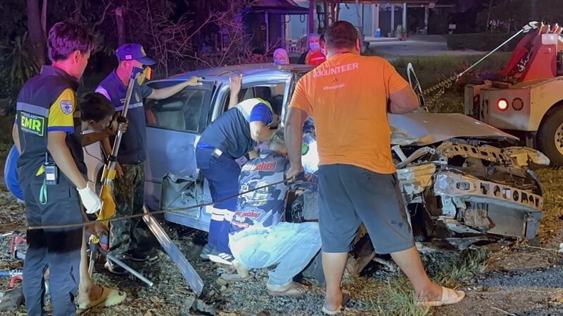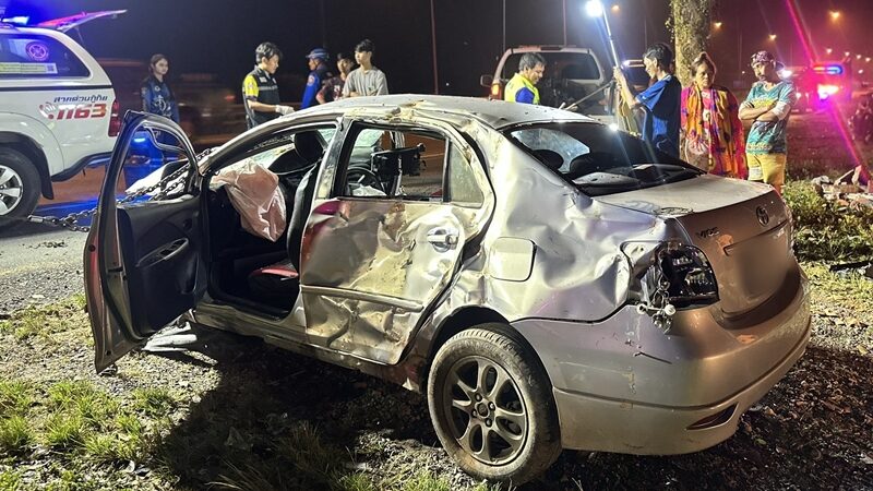 ไปไม่ถึงงานบวชเพื่อน หนุ่มขับเก๋ง หลับใน พุ่งชนต้นไม้พังยับ เจ็บ3ราย