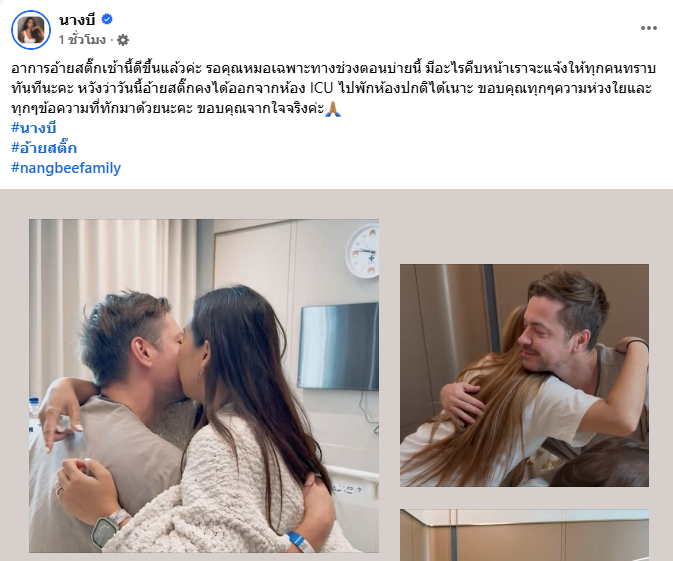 หากมีอะไรคืบหน้าเราจะแจ้งให้ทุกคนทราบทันทีนะคะ หวังว่าวันนี้อ้ายสติ๊กคงได้ออกจากห้อง ICU ไปพักห้องปกติได้เนาะ ขอบคุณทุกๆ ความห่วงใยและทุกๆข้อความที่ทักมาด้วยนะคะ ขอบคุณจากใจจริงค่ะ #นางบี #อ้ายสติ๊ก #nangbeefamily