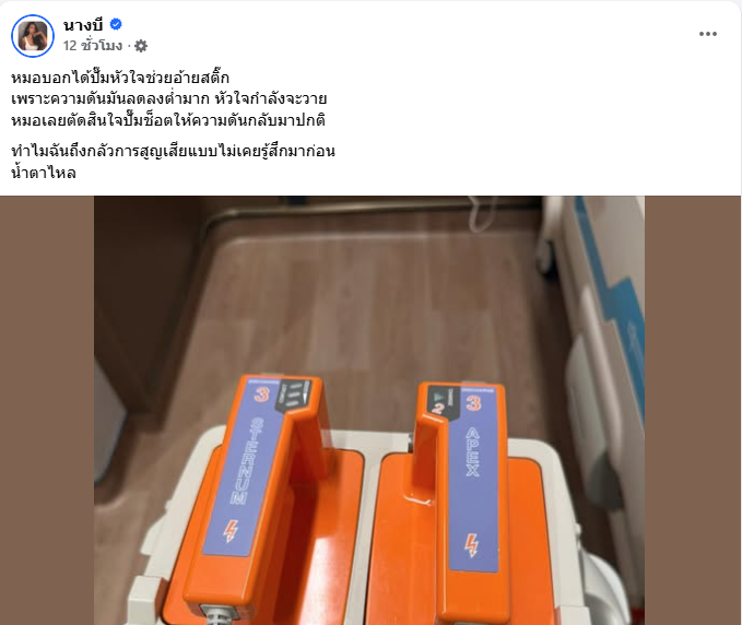 นอกจากนี้ นางบี ยังโพสต์อีกว่า หมอบอกได้ปั๊มหัวใจช่วยอ้ายสติ๊ก เพราะความดันมันลดลงต่ำมาก หัวใจกำลังจะวาย หมอเลยตัดสินใจปั๊มช็อตให้ความดันกลับมาปกติ ทำไมฉันถึงกลัวการสูญเสียแบบไม่เคยรู้สึกมาก่อน น้ำตาไหล