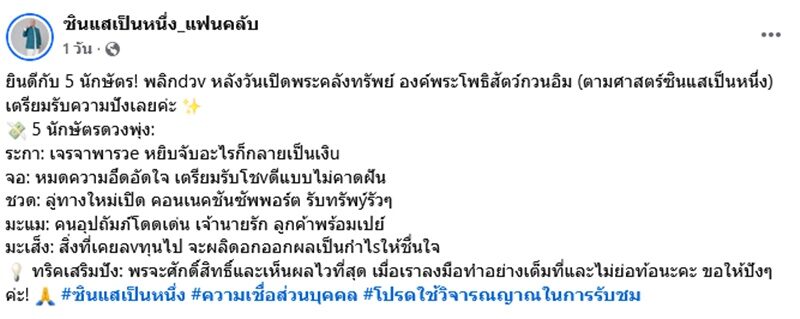 ซินแสเป็นหนึ่ง โพสต์ก่อนวันหวยออก สำหรับคนดวงปัง 5 ปีนักษัตร จะเปลี่ยนดวงครั้งใหญ่ว่า “ยินดีกับ 5 นักษัตร! พลิกดวง หลังวันเปิดพระคลังทรัพย์ องค์พระโพธิสัตว์กวนอิม (ตามศาสตร์ซินแสเป็นหนึ่ง) เตรียมรับความปัง ”