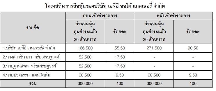 ทั้งนี้ การเข้าทำรายการในครั้งนี้เป็นการเพิ่มสัดส่วนการถือ หุ้นของบริษัท เอจีอี เวนเจอร์ส จำกัด ในบริษัท เอจีอี ออโต้ แกลเลอรี่ จำกัด จากร้อยละ 55.50 เป็นร้อยละ 90.50 ของหุ้นสามัญทั้งหมดของบริษัท เอจีอี ออโต้ แกลเลอรี่ จำกัด โดยโครงสร้างการถือหุ้นของบริษัท เอจีอี ออโต้ แกลเลอรี่ จำกัด ก่อนและหลังเข้าทำรายการมีรายละเอียดดังนี้