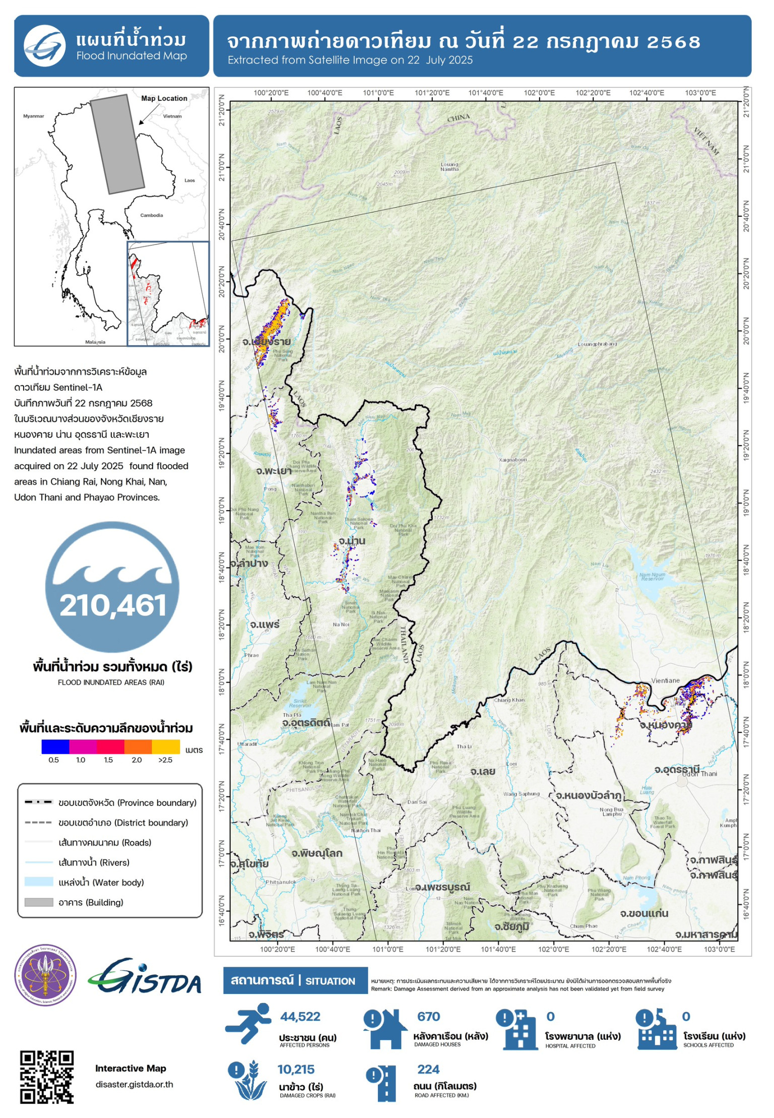 กระทรวงการอุดมศึกษา วิทยาศาสตร์ วิจัยและนวัตกรรม (อว.) โดย GISTDA ติดตามสถานการณ์น้ำท่วมขังจากอิทธิพลของพายุ "วิภา" ด้วยข้อมูลจากดาวเทียม Sentinel-1A ของวันที่ 22 กรกฎาคม 2568 เวลา 18.21 น. พบว่า ขณะนี้มีพื้นที่บางส่วนของภาคเหนือและภาคตะวันออกเฉียงเหนือ ที่ได้รับผลกระทบทั้งสิ้น 210,461 ไร่ ประกอบด้วย #เชียงราย #พะเยา #น่าน #หนองคาย และ #อุดรธานี ซึ่งพื้นที่ที่พบส่วนใหญ่เป็นพื้นที่ลุ่มต่ำ พื้นที่การเกษตร พื้นที่ริมสองฝั่งแม่น้ำสายหลักและสายรอง รวมถึงชุมชนที่อยู่อาศัยและเส้นทางคมนาคมบางส่วน ทั้งนี้ ระดับน้ำท่วมขังจะมีความลึกแตกต่างกันไปตามลักษณะของแต่ละพื้นที่