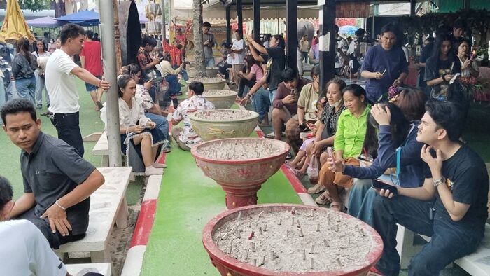 โดยพากันบูชาเครื่องเซ่นไหว้ อย่างดอกกุหลาบแดง น้ำแดง ผ้าแดง ประทัด มากราบไหว้บูชาหน้าองค์ท่านท้าวเวสสุวรรณทรงราหู(ท่านทองล้น) พร้อมทั้งจุดธูปเสี่ยงทายในกระถางขนาดใหญ่หน้าองค์ท้าวเวสสุวรรณทรงราหู(ท่านทองล้น) เพื่อหาเลขเด็ดนำไปซื้อสลากกินแบ่งรัฐบาล ในงวดวันที่ 16 ก.ค.ที่จะถึงนี้ ไว้เสี่ยงโชคลาภกัน