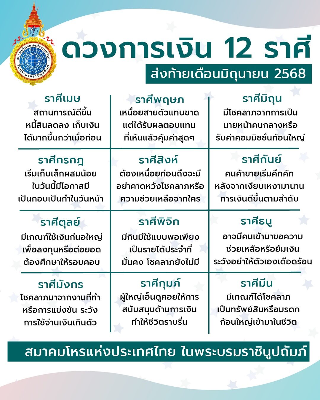 เปิดดวงราศี ส่งท้ายเดือนมิ.ย.68 ระวังโดนยืมเงิน-ใช้จ่ายเกินตัว ต้องเหนื่อยก่อนถึงจะมี