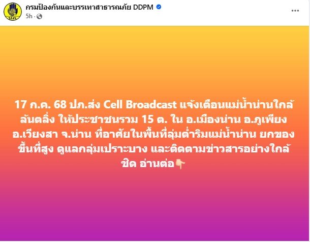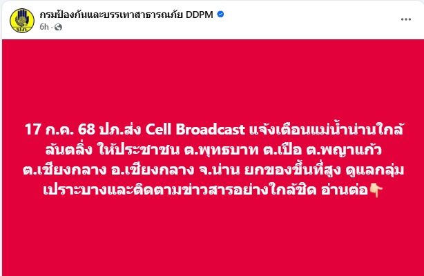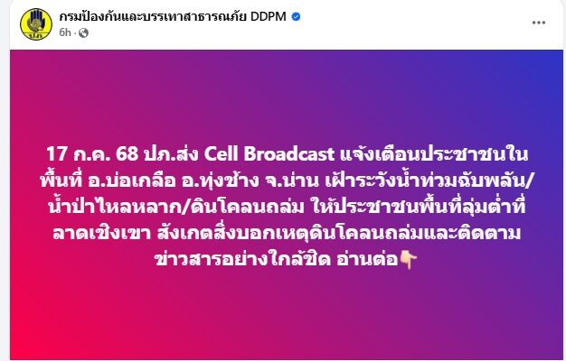 ปภ. จึงร่วมกับผู้ให้บริการเครือข่ายโทรศัพท์เคลื่อนที่ Ais True และ NT ส่งข้อความแจ้งเตือนผ่าน Cell Broadcast แจ้งเตือนแม่น้ำน่านใกล้ล้นตลิ่ง บริเวณพื้นที่ ต.ในเวียง ต.ดู่ใต้ ต.กองควาย ต.บ่อ อ.เมืองน่าน ต.เมืองจัง ต.ฝายแก้ว ต.ท่าน้าว ต.ม่วงตึ๊ด ต.นาปัง อ.ภูเพียง และ ต.น้ำปั้ว ต.ตาลชุม ต.ไหล่น่าน ต.กลางเวียง ต.ส้าน ต.ขึ่ง อ.เวียงสา