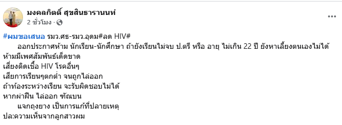 “#ผมขอเสนอ รมว.ศธ-รมว.อุดม #ลดHIV #ออกประกาศห้ามนักเรียน-นักศึกษา ถ้ายังเรียนไม่จบ ป.ตรี หรืออายุไม่เกิน 22 ปี ยังหาเลี้ยงตนเองไม่ได้ ห้ามมีเพศสัมพันธ์เด็ดขาด”