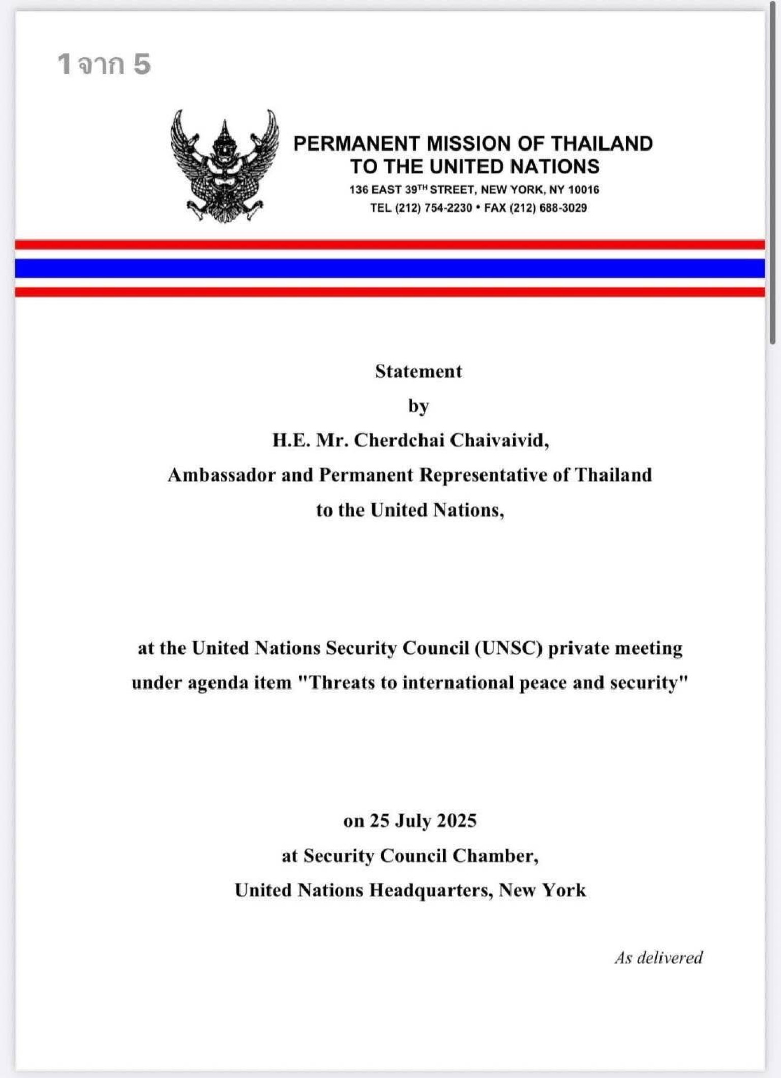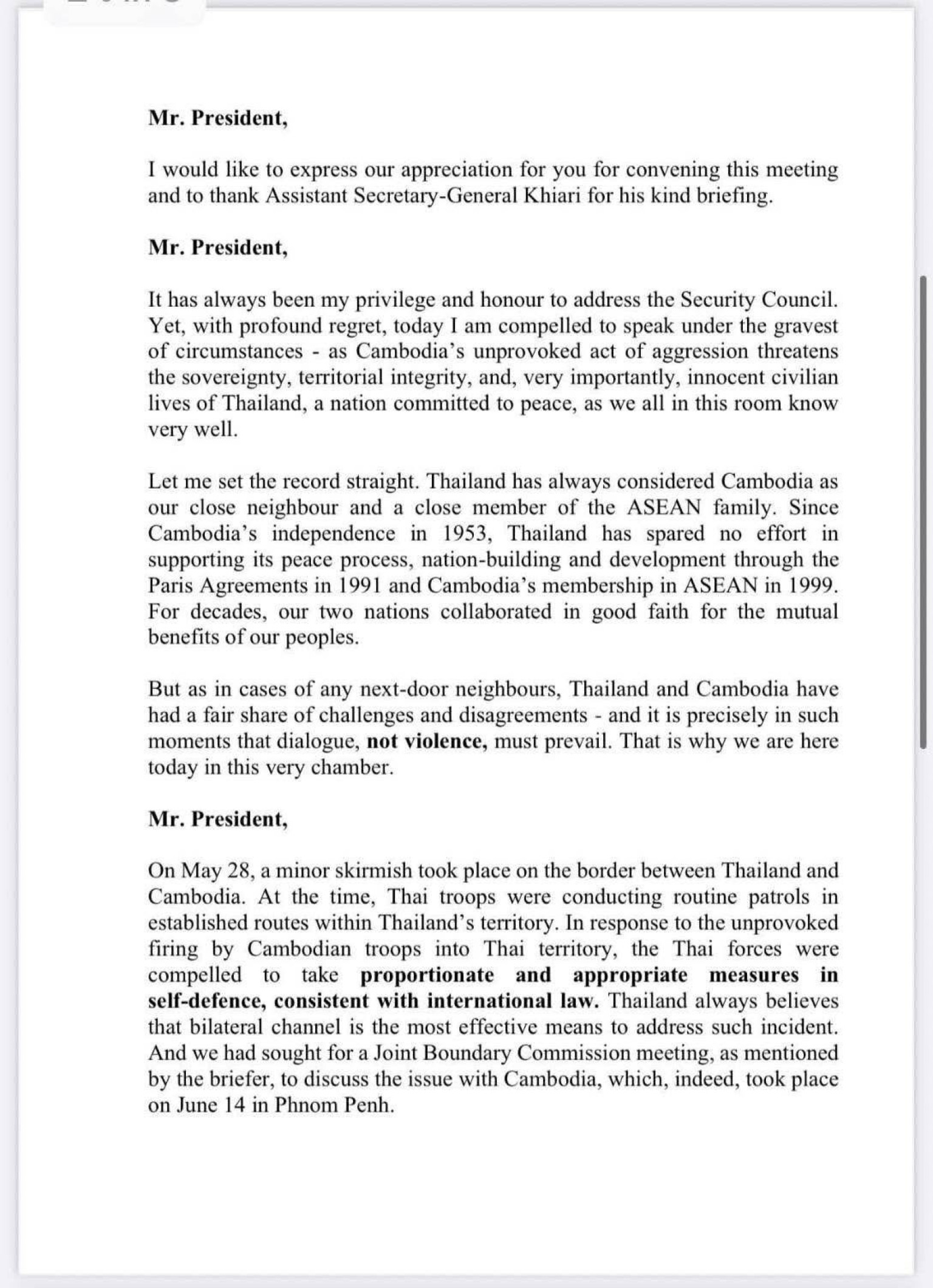 ในฐานะประเทศที่รักสันติ ประเทศไทยปฏิเสธการใช้กำลังเป็นวิธีการแก้ไขข้อพิพาทระหว่างประเทศอย่างเด็ดขาด โดยยังคงมุ่งมั่นอย่างแน่วแน่ต่อการระงับข้อพิพาทอย่างสันติ โดยสอดคล้องกับกฎบัตรสหประชาชาติ ในช่วงสองเดือนที่ผ่านมา ประเทศไทยได้มีส่วนร่วมอย่างแข็งขันกับกัมพูชาผ่านกลไกทวิภาคีหลายประการ รวมถึงคณะกรรมาธิการร่วมชายแดน (JBC) ดังกล่าว โดยมีวัตถุประสงค์เพื่อแก้ไขความแตกต่างและป้องกันการยกระดับ ดังนั้น คณะมนตรีจึงเสียใจอย่างยิ่งที่กัมพูชา จงใจบ่อนทำลายการเจรจาที่มีความหมาย และพยายามทำให้ปัญหาเป็นสากลเพื่อบรรลุวัตถุประสงค์ของตนเอง