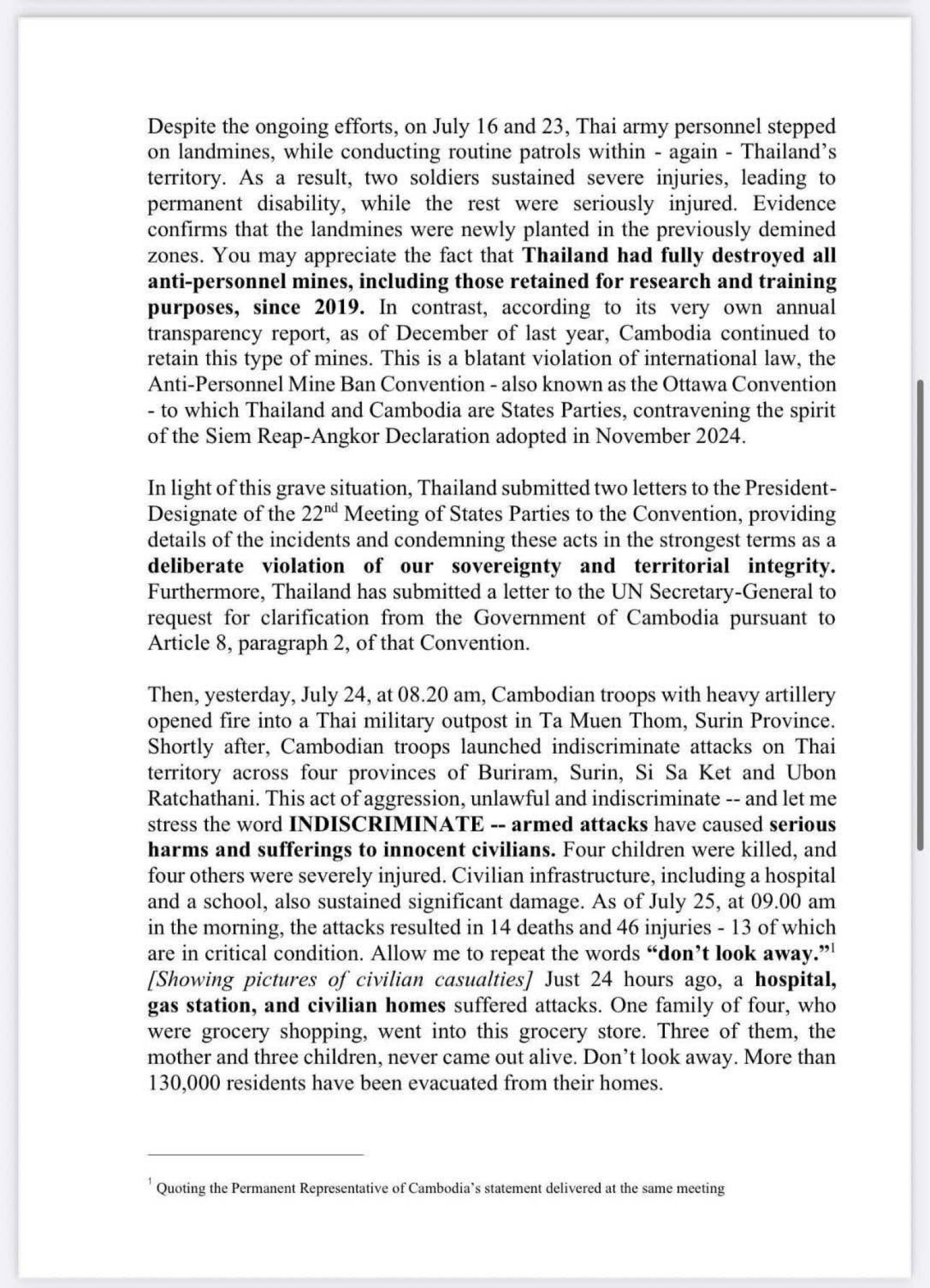 จากนั้น เมื่อวันที่ 24 กรกฎาคม เวลา 08.20 น. กองกำลังกัมพูชาได้เปิดฉากยิงปืนใหญ่หนักเข้าใส่ฐานทัพไทยที่ตำบลตาโมกข์ ตม. สุรินทร์ หลังจากนั้นไม่นาน กองกำลังกัมพูชาก็เปิดฉากโจมตีพลเรือนอย่างไม่เลือกหน้าในพื้นที่ชายแดนไทยสี่จังหวัด ได้แก่ บุรีรัมย์, สุรินทร์, ศรีสะเกษ และอุบลราชธานี การกระทำที่เลือกปฏิบัติ ผิดกฎหมาย และไร้มนุษยธรรมนี้ – และขอให้ผมเน้นย้ำคำว่า การเลือกปฏิบัติ – การโจมตีด้วยอาวุธทำให้เกิด อันตรายร้ายแรงและความทุกข์ทรมานต่อพลเรือน มีพลเรือนสี่รายเสียชีวิต และอีกสี่รายได้รับบาดเจ็บสาหัส โครงสร้างพื้นฐานของพลเรือน รวมถึงโรงพยาบาลและโรงเรียน ก็ได้รับความเสียหายอย่างหนัก
