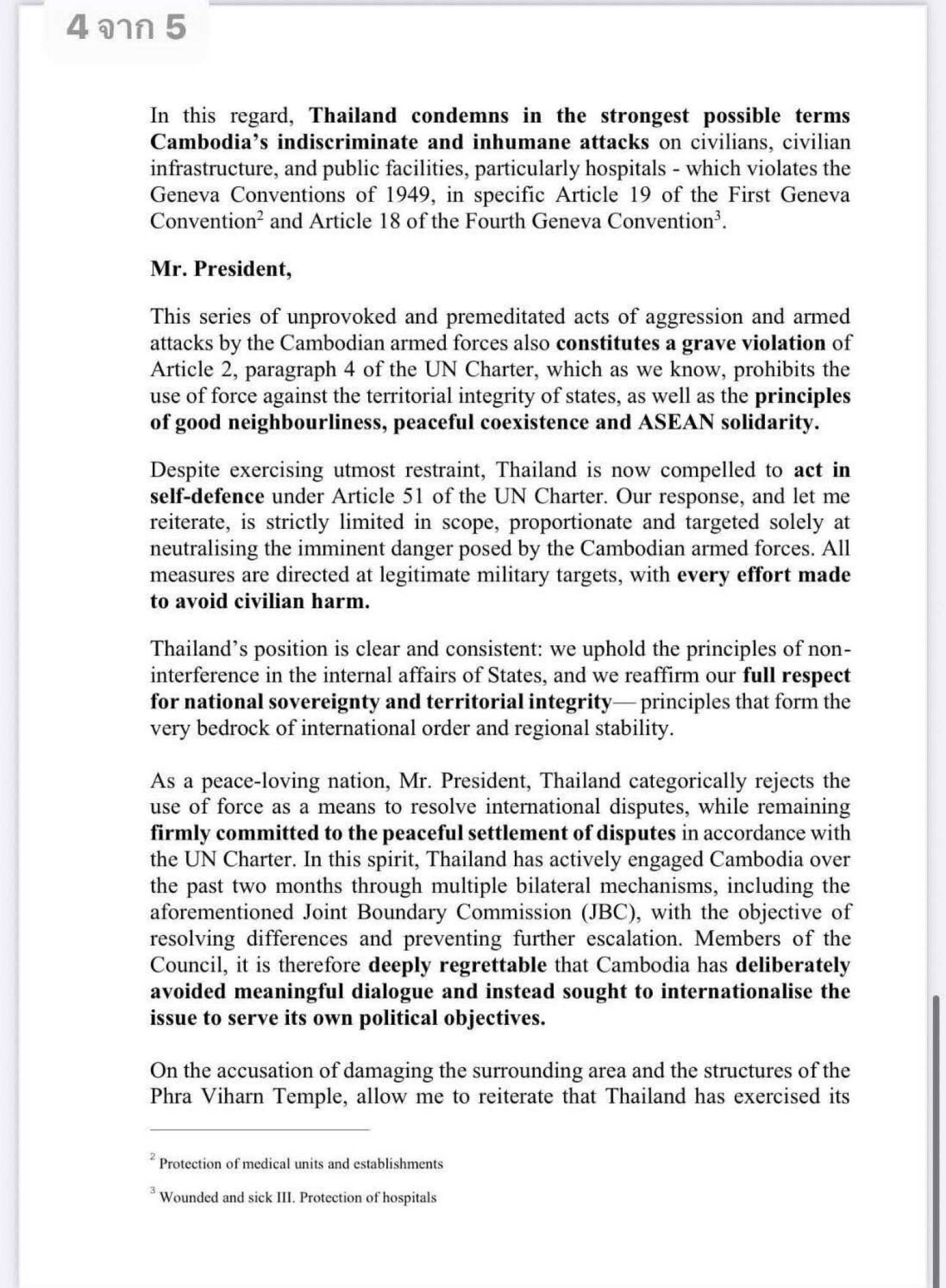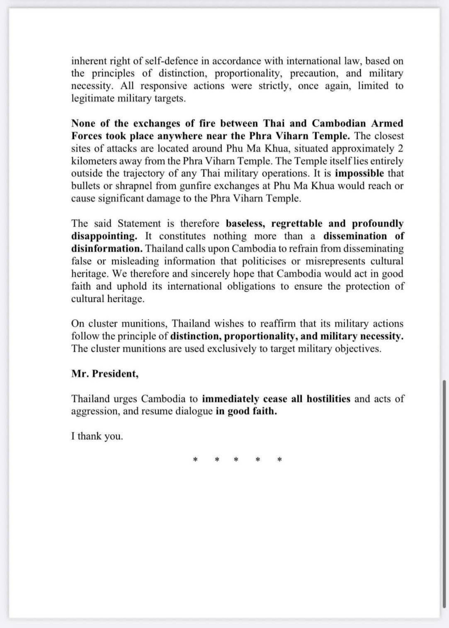 แม้จะมีความอดทนอย่างที่สุด ประเทศไทยก็ถูกบังคับให้ต้อง กระทำเพื่อป้องกันตนเองภายใต้มาตรา 51 ของกฎบัตรสหประชาชาติ การตอบสนองของเราถูกจำกัดอย่างเคร่งครัดในขอบเขต ได้สัดส่วน และมุ่งเป้าไปที่การทำให้ภัยคุกคามที่กำลังจะเกิดขึ้นจากกองกำลังกัมพูชาเป็นกลางเท่านั้น มาตรการทั้งหมดมุ่งเป้าไปที่เป้าหมายทางทหารที่ชอบด้วยกฎหมาย โดยมีความพยายามทุกวิถีทางเพื่อหลีกเลี่ยงการทำร้ายพลเรือน