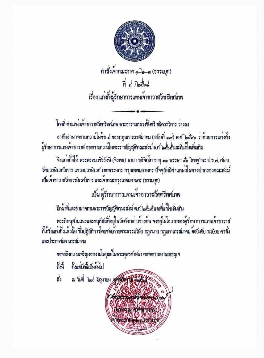 ผู้สื่อข่าวรายงานว่า เมื่อเร็ว ๆ นี้ เจ้าคณะภาค 1-2-3 (ธรรมยุต) ได้มีคำสั่งเจ้าคณะภาค 1-2-3 (ธรรมยุต) เรื่อง แต่งตั้งผู้รักษาการแทนเจ้าอาวาสวัดตรีทศเทพ ระบุว่า โดยที่ตำแหน่งเจ้าอาวาสวัดตรีทศเทพ ว่างลง จึงแต่งตั้งให้พระพรหมวชิรรังษี เจ้าคณะกรุงเทพมหานคร (ธรรมยุต) เป็นผู้รักษาการแทนเจ้าอาวาสวัดตรีทศเทพ