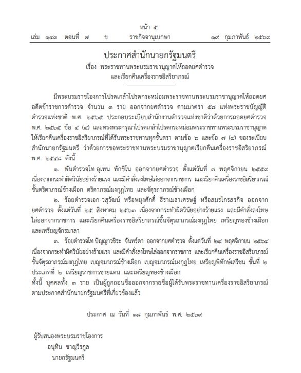 ราชกิจจาฯ ประกาศสำนักนายกรัฐมนตรี มีพระบรมราชโองการโปรดเกล้าฯ ถอดยศตำรวจ และเรียกคืนเครื่องราชอิสริยาภรณ์ จำนวน 3 ราย ทำผิดวินัยร้ายแรง
