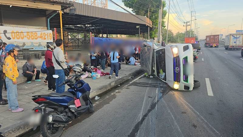 รถกระบะพลิกคว่ำ คนงานโรงงานเจ็บ15 เผยรถตามหลังเฉี่ยวหักหลบเสียหลัก