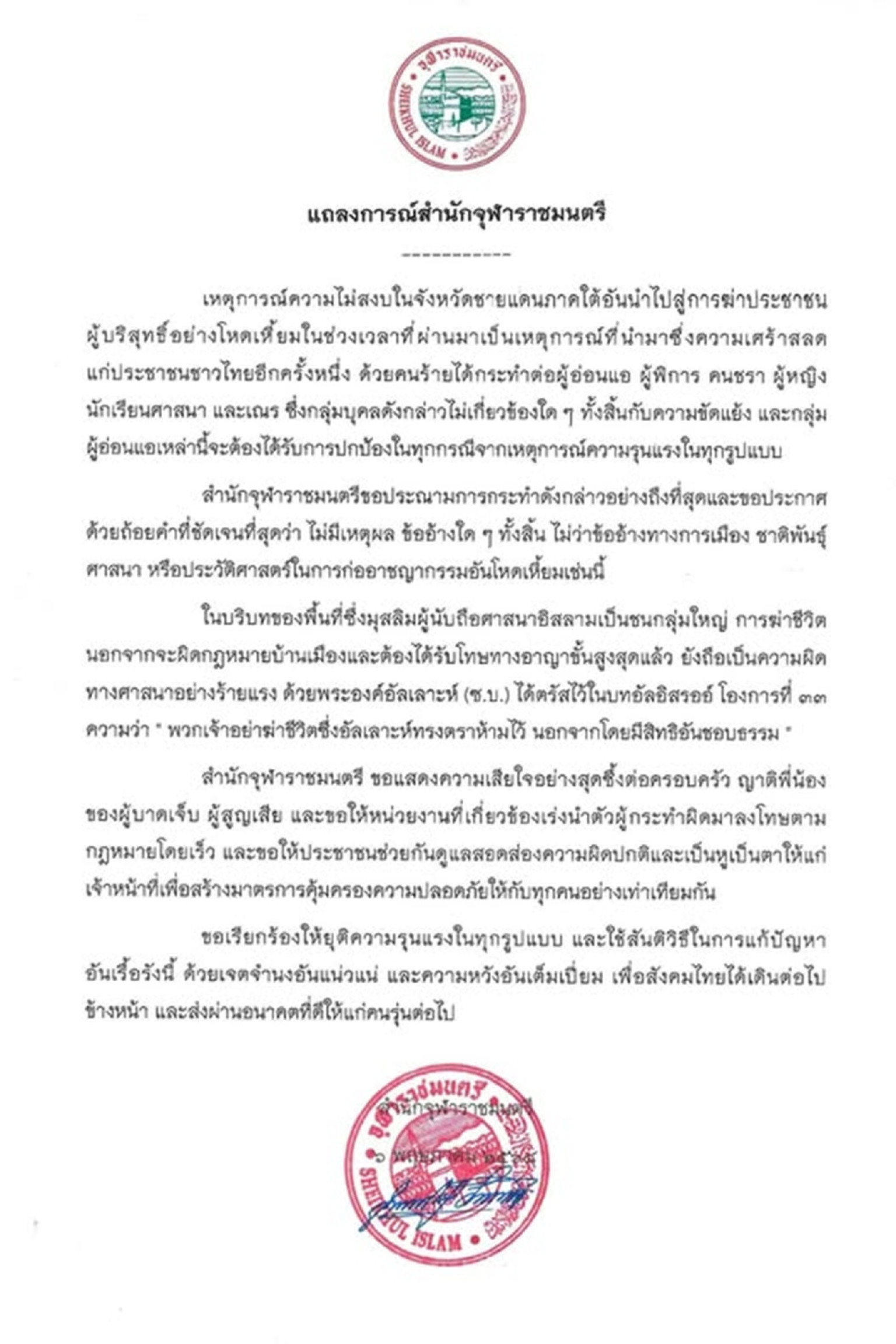 สำนักจุฬาราชมนตรี ขอแสดงความเสียใจอย่างสุดซึ้งต่อครอบครัว ญาติพี่น้องของผู้บาดเจ็บ ผู้สูญเสีย และขอให้หน่วยงานที่เกี่ยวข้องเร่งนำตัวผู้กระทำผิดมาลงโทษตามกฎหมายโดยเร็ว และขอให้ประชาชนช่วยกันดูแลสอดส่องความผิดปกติและเป็นหูเป็นตาให้แก่เจ้าหน้าที่เพื่อสร้างมาตรการคุ้มครองควาปลอดภัยให้กับทุกคนอย่างเท่าเทียมกัน