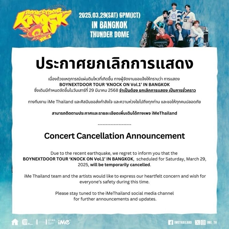 “ประกาศยกเลิกการแสดงชั่วคราว เนื่องด้วยเหตุการณ์แผ่นดินไหวที่เกิดขึ้น ทางผู้จัดงานขอแจ้งให้ทราบว่า การแสดง BOYNEXTDOOR TOUR ‘KNOCK ON Vol.1’ IN BANGKOK ซึ่งเดิมมีกำหนดจัดขึ้นในวันเสาร์ที่ 29 มีนาคม 2568 จำเป็นต้อง ยกเลิกการแสดง เป็นการชั่วคราว”