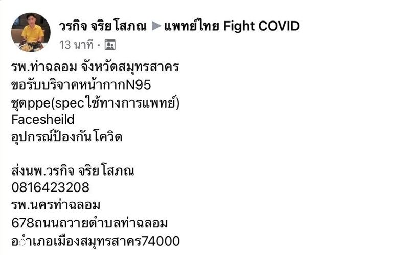 ล่าสุด นพ.วรกิจ จริยโสภณ แพทย์ประจำโรงพยาบาลนครท่าฉลอม ได้โพสต์ไปยังกลุ่ม "แพทย์ไทย Fight COVID" ว่า รพ.ท่าฉลอม จังหวัดสมุทรสาคร ขอรับบริจาคหน้ากาก N95 ชุด ppe (specใช้ทางการแพทย์) Facesheild อุปกรณ์ป้องกันโควิด