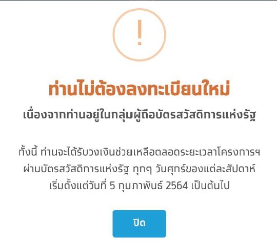 ส่วนกลุ่มผู้ถือบัตรสวัสดิการแห่งรัฐ ไม่ต้องลงทะเบียน รัฐบาลจะจัดสรรวงเงินรอบแรกให้เป็นรายสัปดาห์ ทุกวันศุกร์ สัปดาห์ละ 675 หรือ 700 บาท เริ่มตั้งแต่วันที่ 5 ก.พ.เป็นต้นไป สะสมได้จนถึง 31 พ.ค.