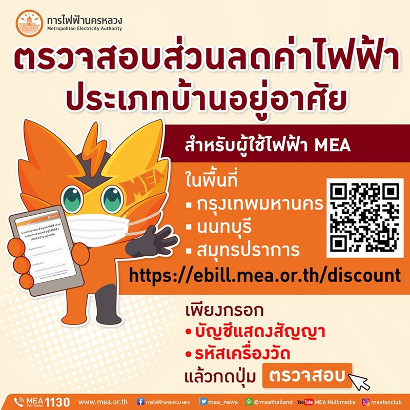 ล่าสุดวันที่ 18 พ.ค. ผู้สื่อข่าวรายงานว่า เฟซบุ๊กแฟนเพจ การไฟฟ้านครหลวง MEA ได้โพสต์ข้อความระบุว่า MEA เปิดบริการตรวจสอบส่วนลดค่าไฟฟ้าสำหรับผู้ใช้ไฟฟ้าประเภทบ้านอยู่อาศัยในพื้นที่กรุงเทพมหานคร นนทบุรี และสมุทรปราการ