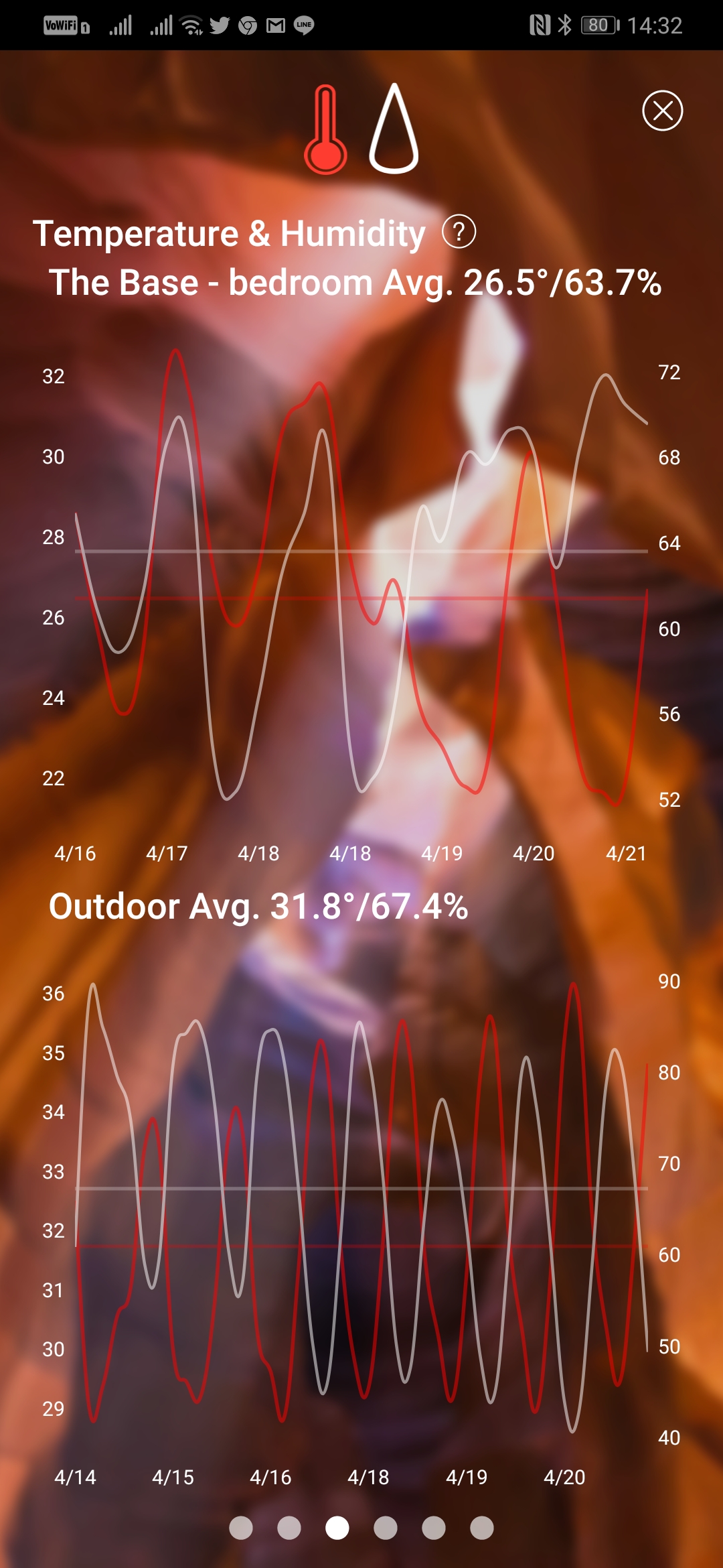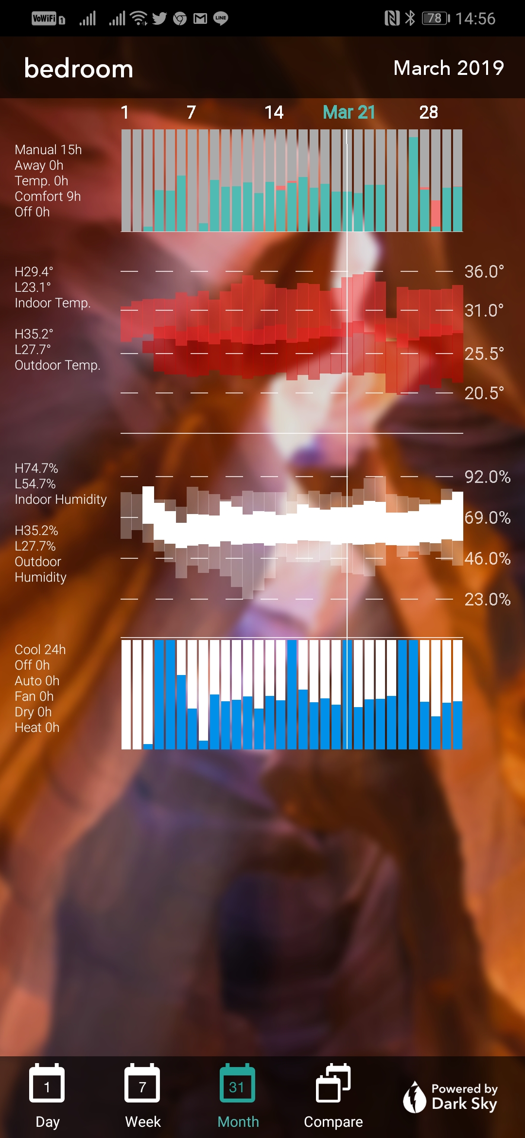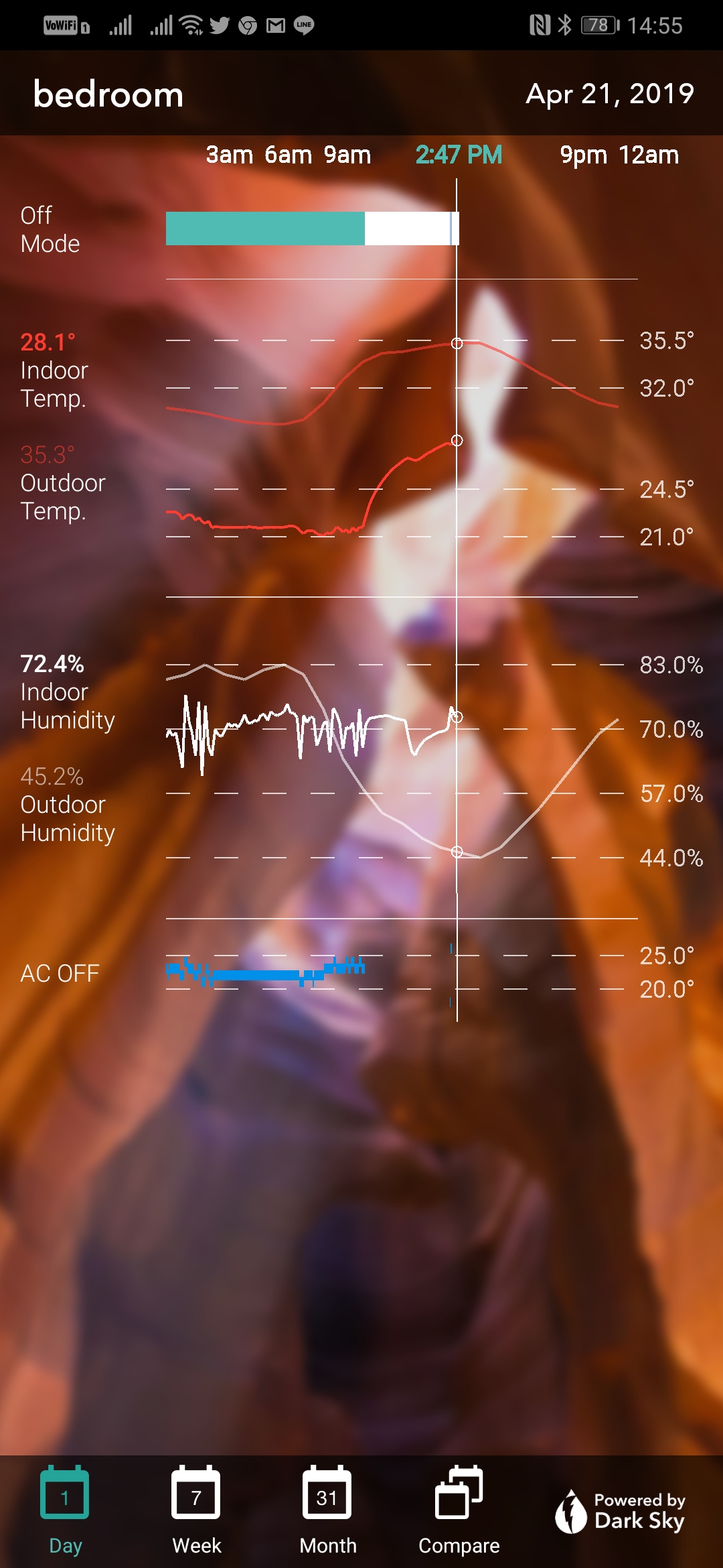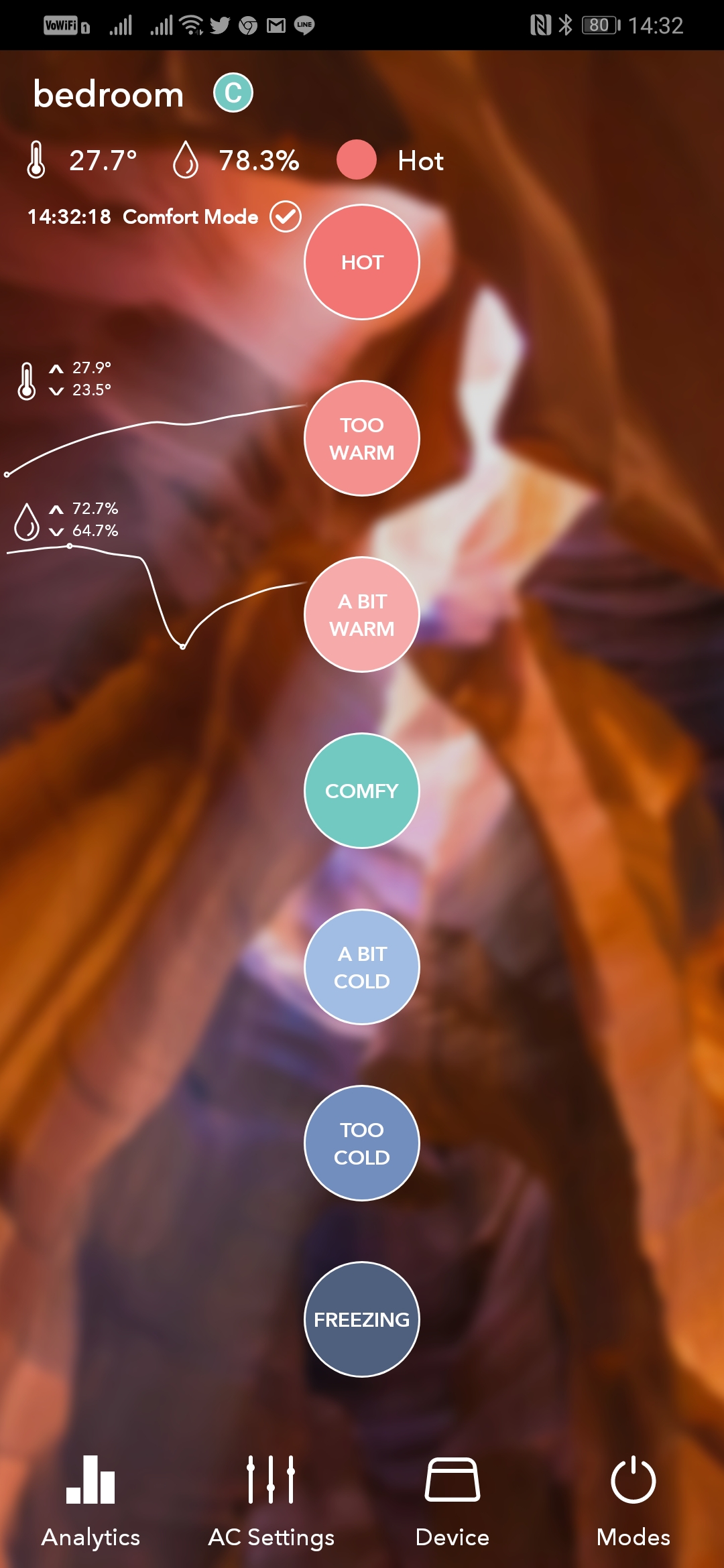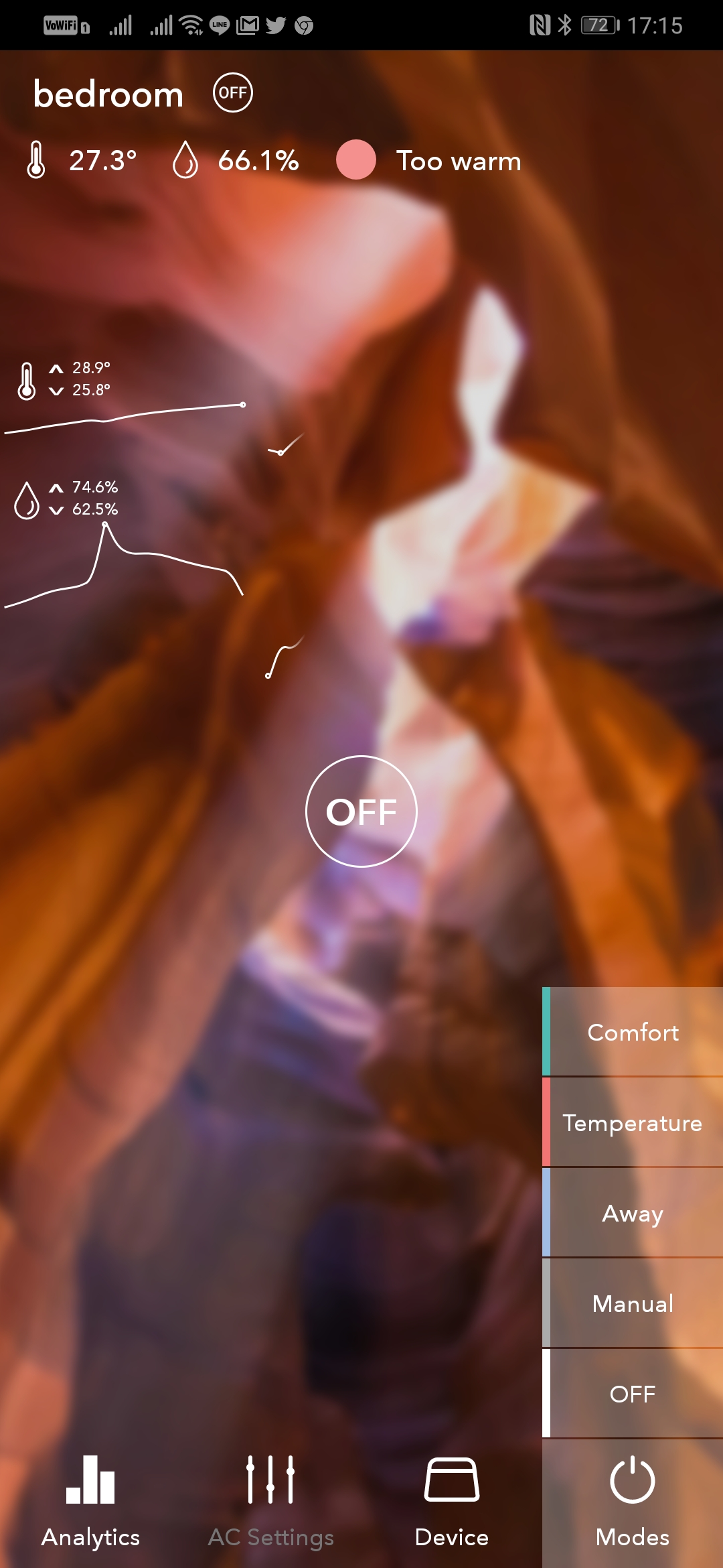- Away โหมดสำหรับยามไม่อยู่บ้าน แต่อยากควบคุมอากาศในห้องโดยกำหนดเป็นระดับขั้นต่ำไว้ เช่นถ้าอุณหภูมิในห้องเกิน 27 องศาให้เปิดแอร์ หรือความชื้นในห้องเกิน 79% ให้เปิดแอร์