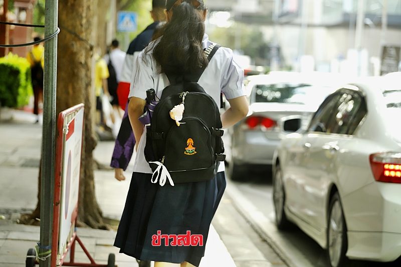 นักเรียนของโรงเรียนหอวัง ผูกโบว์ขาว ไว้ที่เป้สะพายหลัง