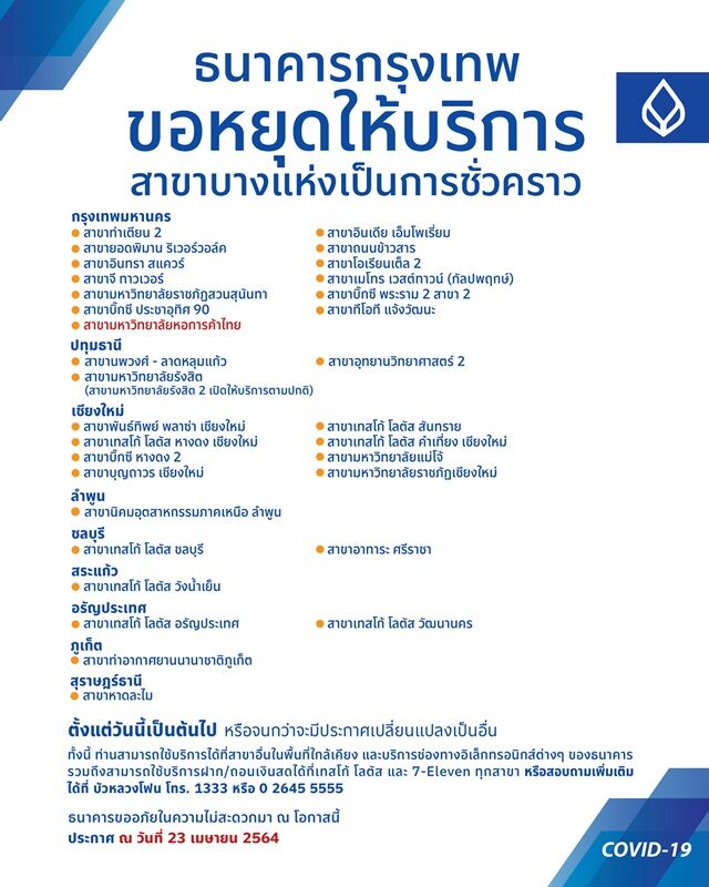 วันที่ 23 เม.ย.64 เฟซบุ๊ก ธนาคารกรุงเทพ โพสต์แจ้งข้อมูล ระบุว่า ธนาคารกรุงเทพขอหยุดให้บริการสาขาบางแห่งเป็นการชั่วคราว ตั้งแต่วันนี้เป็นต้นไป หรือจนกว่าจะมีประกาศเปลี่ยนแปลง